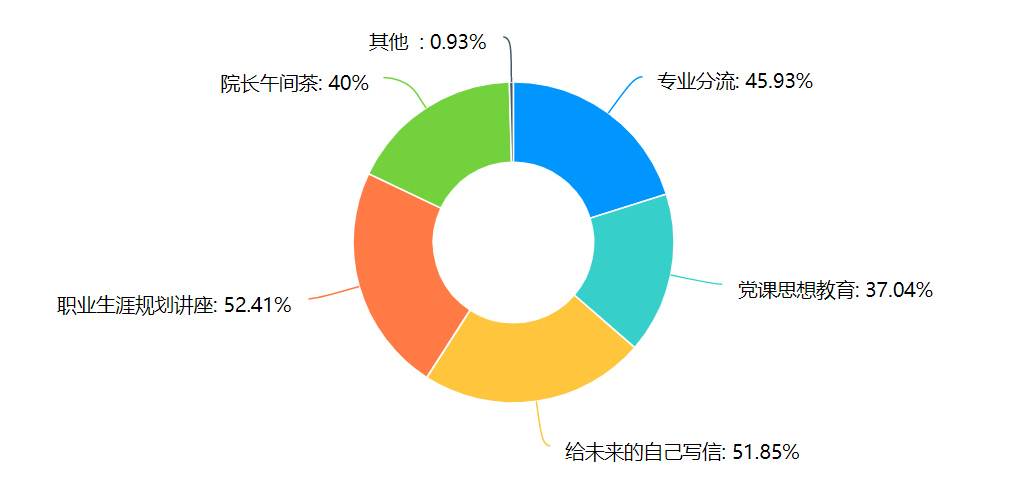 问卷调查显示,在发展规划型活动方面,52.41%的同学对职业生涯规划讲座感兴趣;51.85%的同学对给未来的自己写信等活动感兴趣;45.93%的同学对专业分流类讲座感兴趣;40.00%的同学对院长午间茶感兴趣;37.04%的同学对党课思想教育活动感兴趣。
