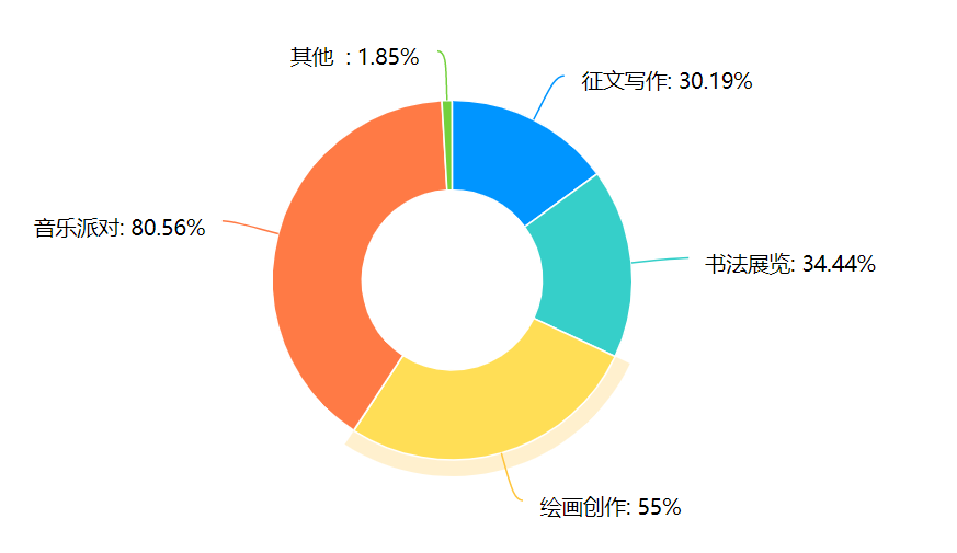 问卷调查显示,在文化艺术类活动方面,约80.56%的同学对音乐派对非常感兴趣,如草地音乐节等;55.00%的同学希望学生会可以多开展绘画创作类活动;30.19%的同学希望多开展征文写作和书法展览类活动。如今,同学们对音乐的热爱程度较深。但由于受疫情影响,目前无法进行线下聚集活动。根据调查结果,我院学生会将创新性采取线上音乐节等活动丰富同学们的课余生活。