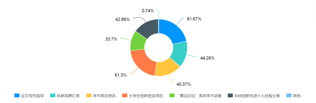 调查结果显示,在科研交流活动方面,我院同学大都渴望获得对自身科研发展有所帮助的交流机会。约60.00%的同学希望能够多开展论文写作指导以及与大学生创新创业比赛相关的交流活动。有同学表示:“在没有指导的情况下,论文的写作毫无头绪”;40.00 %左右的同学希望得到学术前沿资讯的学习机会,希望可以搭建一个向优秀学长学姐交流与学习的平台;33.70%的同学希望能够参与“青山论坛”等学院的系列学术讲座,听取专业老师对前沿领域研究成果的分享。由调查数据可知,学生们对目前接触较多的学术知识更加感兴趣。