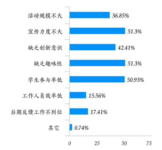 在调研关于“经管院学生会在组织活动过程中出现的问题”的时候,各有51.30%的同学表示“宣传力度不大”和“缺乏趣味性”;有50.93%的同学表示“学生参与率低”;有42.41%的同学表示“缺乏创新意识”;有36.85%的同学表示“活动规模不大”;有15.56%的同学表示“工作人员效率低”;有17.41%的同学表示“后期反馈工作不到位”;有0.74%的同学选择“其他”。十九栋四楼的王同学说:“不少活动对学生吸引力不强,而且活动安排时间不够灵活,很多时候,并不是同学不想参与,而是与其他行程冲突。”