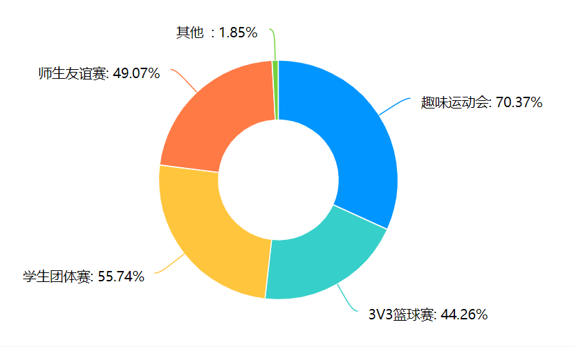 从图表中可以看出,在体育活动方面,70.00%的同学希望举办趣味运动会,55.00%的同学希望参加体育团体赛,49.07%的同学希望开展师生友谊赛,44.26%的同学希望举办3v3篮球赛。从调研结果分析可知,大多数学生更倾向于参加趣味运动会及群众性体育活动等参与门槛较低、更具普适性的活动。