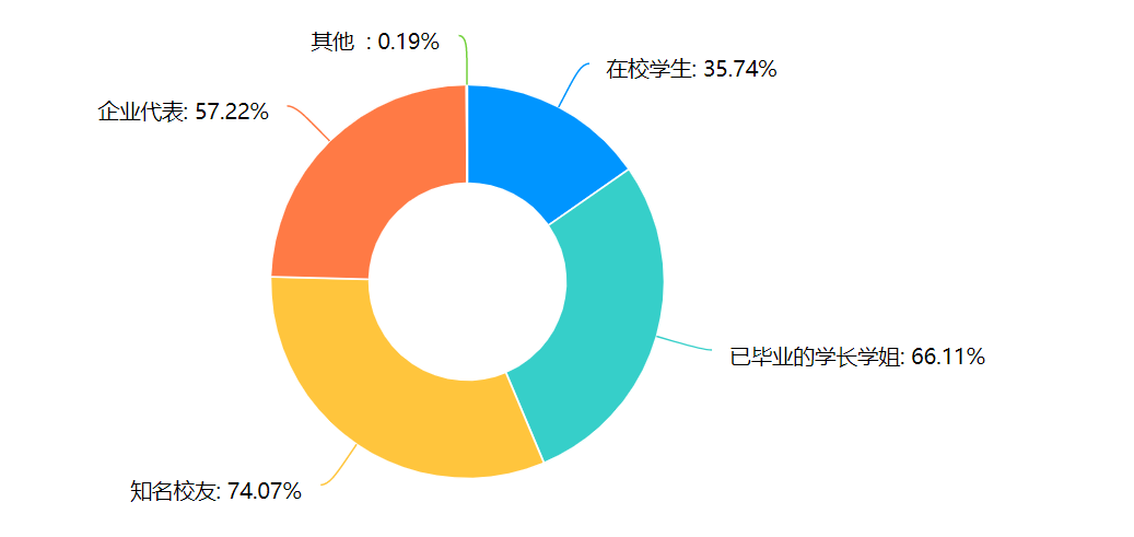 对于此类活动的主讲人员,调研数据显示,有74.07%的同学希望知名校友作为主讲人员;有66.11%的同学希望已毕业的学长学姐作为主讲人员;有57.22%的同学希望企业代表作为主讲人员;有35.74%的同学希望在校学生作为主讲人员。除此之外,访谈发现,在刚步入校园时,部分同学对未来的发展会感到迷茫,希望通过这类活动获得具有同样经历的学长学姐们的一些建议,与此同时也希望得到院长与老师们的一些建议。