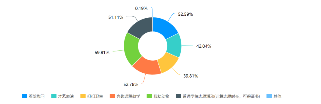 调研数据显示,在志愿服务活动类型方面,有59.81%的同学希望参加救助动物类活动;有52.59%的同学希望参加看望慰问类活动;有52.78%的同学希望参加兴趣课程教学类活动;除此之外,有40.00%左右的同学希望参加才艺表演等志愿活动。
