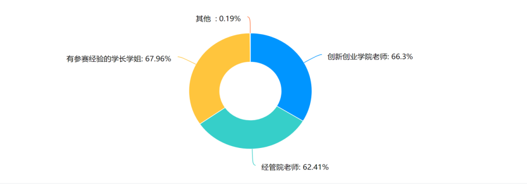 根据调查结果显示,在竞赛指导型活动方面,有超过60.00%的同学想要接受“挑战杯”全国大学生课外学术科技作品竞赛、“互联网+”大学生创新创业大赛和全国大学生英语竞赛的指导;有47.04%的同学想要得到职业生涯规划大赛方面的指导;有36.11%的同学想要得到数学建模竞赛方面的指导。调研结果还显示,超过60.00%的同学希望得到具有参赛经验的学长学姐的经验分享以及创新创业学院和经管院老师的指导。
