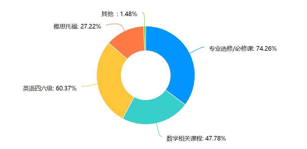 据调查结果显示,绝大多数的同学希望在专业课与数学类课程的学习上得到老师或同学的帮助,在四六级上也希望得到系统的指导。目前,学生们都可以通过办公室电话联系到各科任课老师并得到相应学习指导,我院也开有面向有留学意向的同学们的托举班来授课雅思托福,但是同学们没有可以系统学习四六级的渠道。所以,我院后续可以专门开设四六级辅导课,邀请外语院的老师系统地教授相关学习技巧。