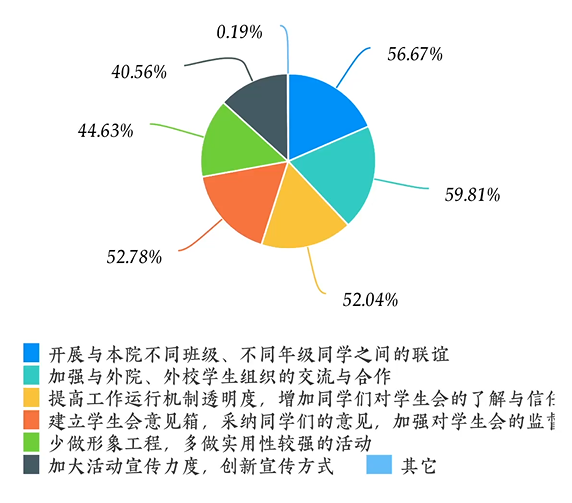 在对“学生会可以改进的地方”进行调研时,有56.67%的同学表示可以“开展与本院不同班级、不同年级同学之间的联谊”;有59.81%的同学表示可以“加强与外院、外校学生组织的交流与合作”;有52.04%的同学表示可以“提供工作运行机制透明度,增强同学们对学生会的了解与信任”;有52.78%的同学表示应“建立学生会意见箱,采纳同学们的意见,加强对学生会的监督”;有44.63%的同学表示要“少做形象工程,多做实用性较强的活动”;有40.56%的同学表示要“加大活动宣传力度,创新宣传方式”;还有0.19%的同学发表了其他意见和建议。