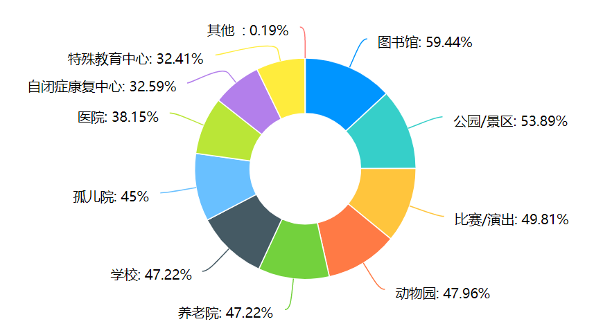 调查结果显示,在志愿服务活动地点方面,有59.44%的同学希望前往图书馆进行志愿服务;有53.89%的同学希望前往公园、景区等开放性场所进行志愿服务;有47.00%左右的同学希望前往比赛或演出现场、动物园、养老院、学校、孤儿院等场所进行志愿服务;有30.00%-40.00%的同学希望前往医院、自闭症康复中心、特殊教育中心等地点进行志愿服务。从访谈中可知,大部分同学愿意参加各种类型的志愿活动,对活动地点的选择也很广泛。