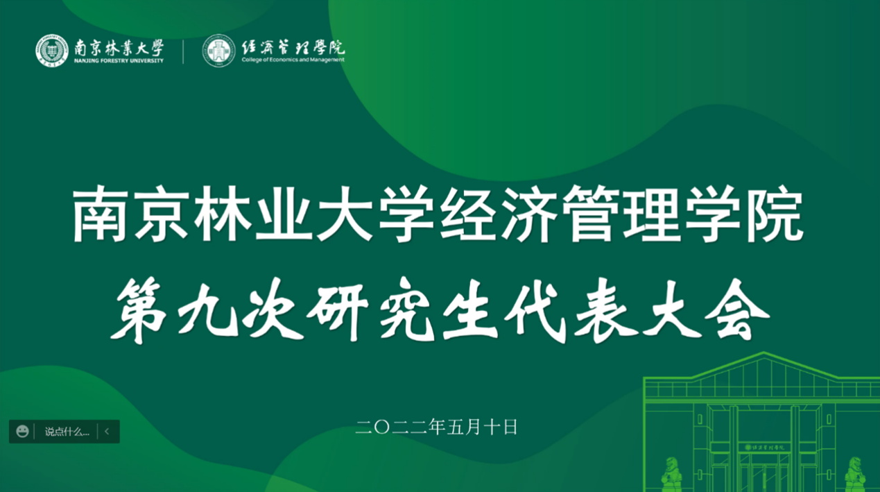 2022年5月10日晚,南京林业大学经济管理学院第九次研究生代表大会于线上腾讯会议顺利召开。研究生辅导员赵淑颖老师出席了本次会议,经济管理学院研究生会主席团成员、各部门部长及学院第九届研究生会主席团候选人参加了本次会议,会议由院研会主席陈丽娜主持。