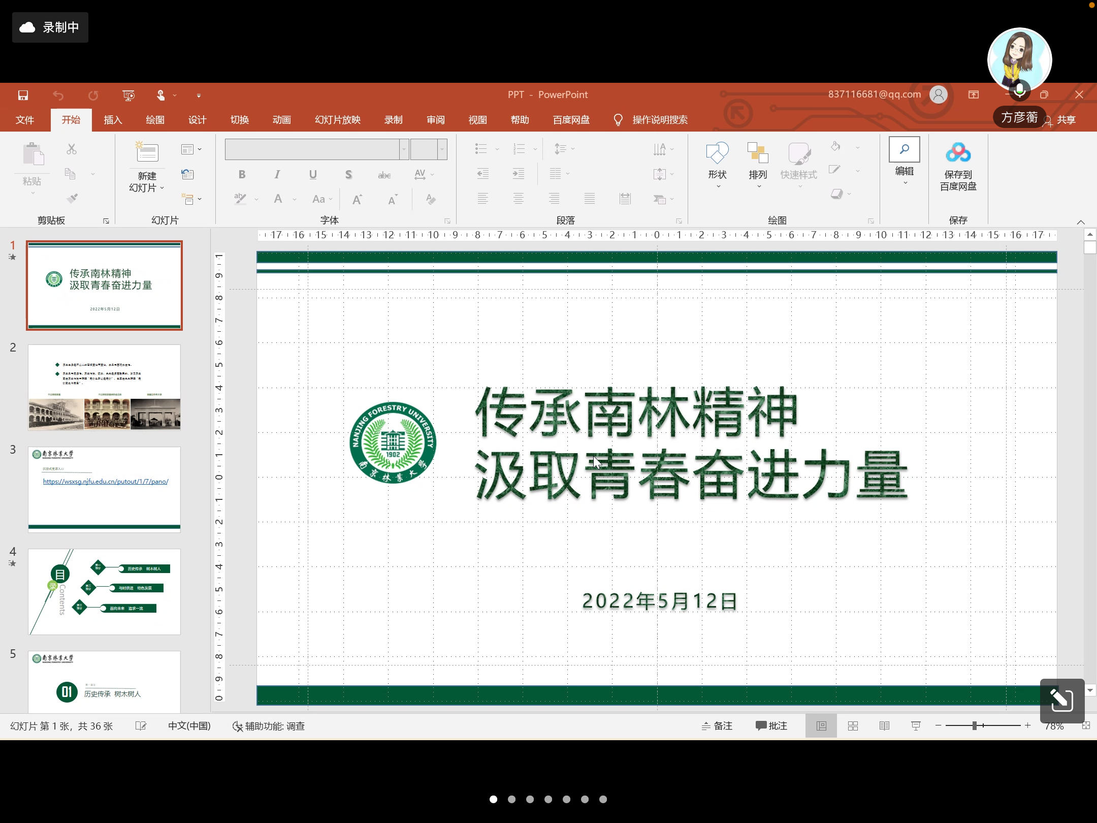 “如果说梁希精神给南林确立的是初心使命与责任担当;那么水杉精神给南林确立的则是科学态度与学术品格,而这些也是母校能够给予你们的最优质的文化基因和取之不竭的人文财富……”5月12日下午,经济管理学院第45期积极分子培训班第三讲“云端”开讲。本次党课以“传承南林精神,汲取青春奋进力量”为主题,由校党委宣传部正科级秘书方彦蘅主讲,经济管理学院党委组织委员赵淑颖主持,全体培训班学员通过线上方式参加了学习。