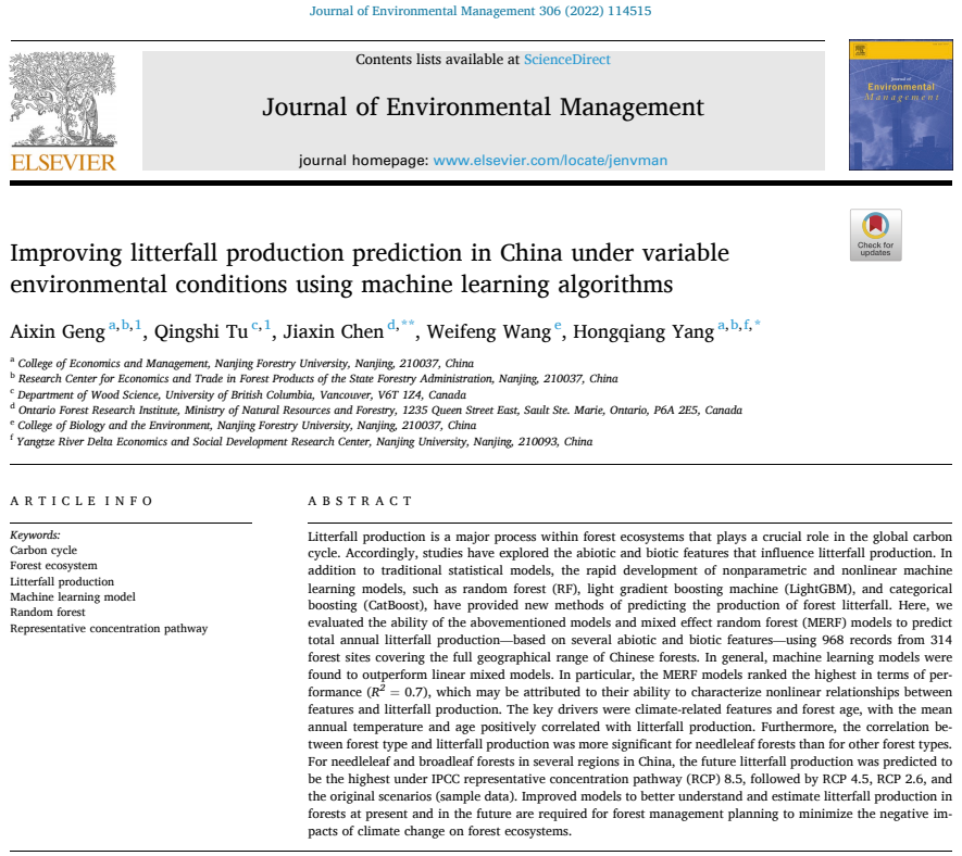 日前,我院农林经济系青年教师耿爱欣博士(第一作者)与加拿大UBC大学Qinshi Tu 教授、安大略林业部林业研究所陈家新教授、王维枫教授、杨红强教授等合作完成的科研论文Improving litterfall production prediction in China under variable environmental conditions using machine learning algorithms(基于机器学习算法对多变环境条件下中国森林凋落物产量预测的改进)在Journal of Environmental Management(SCI Q1,Top期刊)2022年第306卷发表。Journal of Environmental Management是环境管理学领域的国际权威期刊,最新影响因子为6.789。