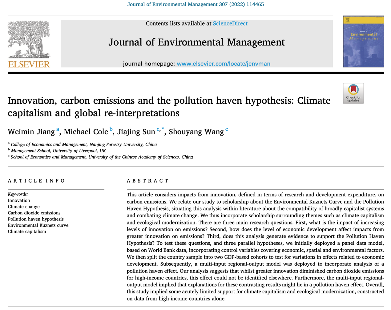 日前,我院应用经济学系青年教师姜卫民博士(第一作者)与中国科学院大学孙佳婧副教授、汪寿阳教授和University of Liverpool(利物浦大学)的Michael Cole合作撰写的科研论文“Innovation, carbon emissions and the pollution haven hypothesis: Climate capitalism and global re-interpretations”在环境管理学领域国际权威期刊Journal of Environmental Management(SCI Q1,Top期刊)2022年第307卷发表。Journal of Environmental Management是环境管理学领域的国际权威期刊,影响因子为6.789。
