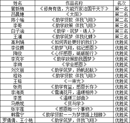 征文活动不仅让学生系统地了解国家资助的相关政策,清晰地认识到学生资助工作的重要意义,对资助工作的各个程序、流程有了更深的认识。同时也进一步明确学院今后资助工作的方向,即要加强学生资助工作在感恩文化、责任文化、诚信文化、自信文化等文化建设上的作用,培养受助学生诚信、自信的品质。