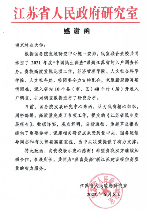 近日,江苏省人民政府研究室专门致信我校,对我院具体负责的2021年度“中国民生调查”课题江苏省入户调查工作做出的各项贡献表示感谢。2021年9月,以我院师生为主体的调查组,克服新冠肺炎疫情困难,深入省内10个县(市、区)40个村(居)开展入户调查,并对调查数据进行了研究分析。我院副院长高强教授为该课题负责人。