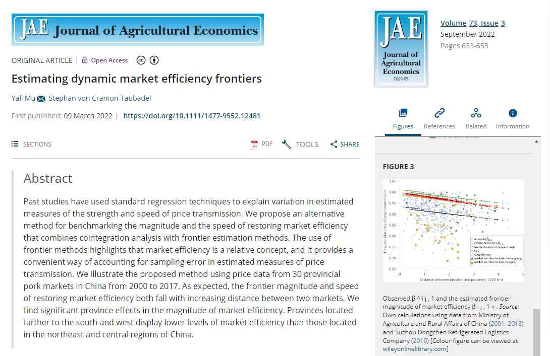 近日,我院应用经济学系青年教师穆亚丽博士(第一作者兼通讯作者)与德国哥廷根大学农业与农村发展学院教授Stephan von Cramon-Taubadel 合作完成的科研论文Estimatingdynamic market efficiency frontiers 在农业经济学领域高水平权威期刊Journal ofAgricultural Economics (SSCI/SCI Top Journal)于2022年第73卷第3期正式见刊发表。