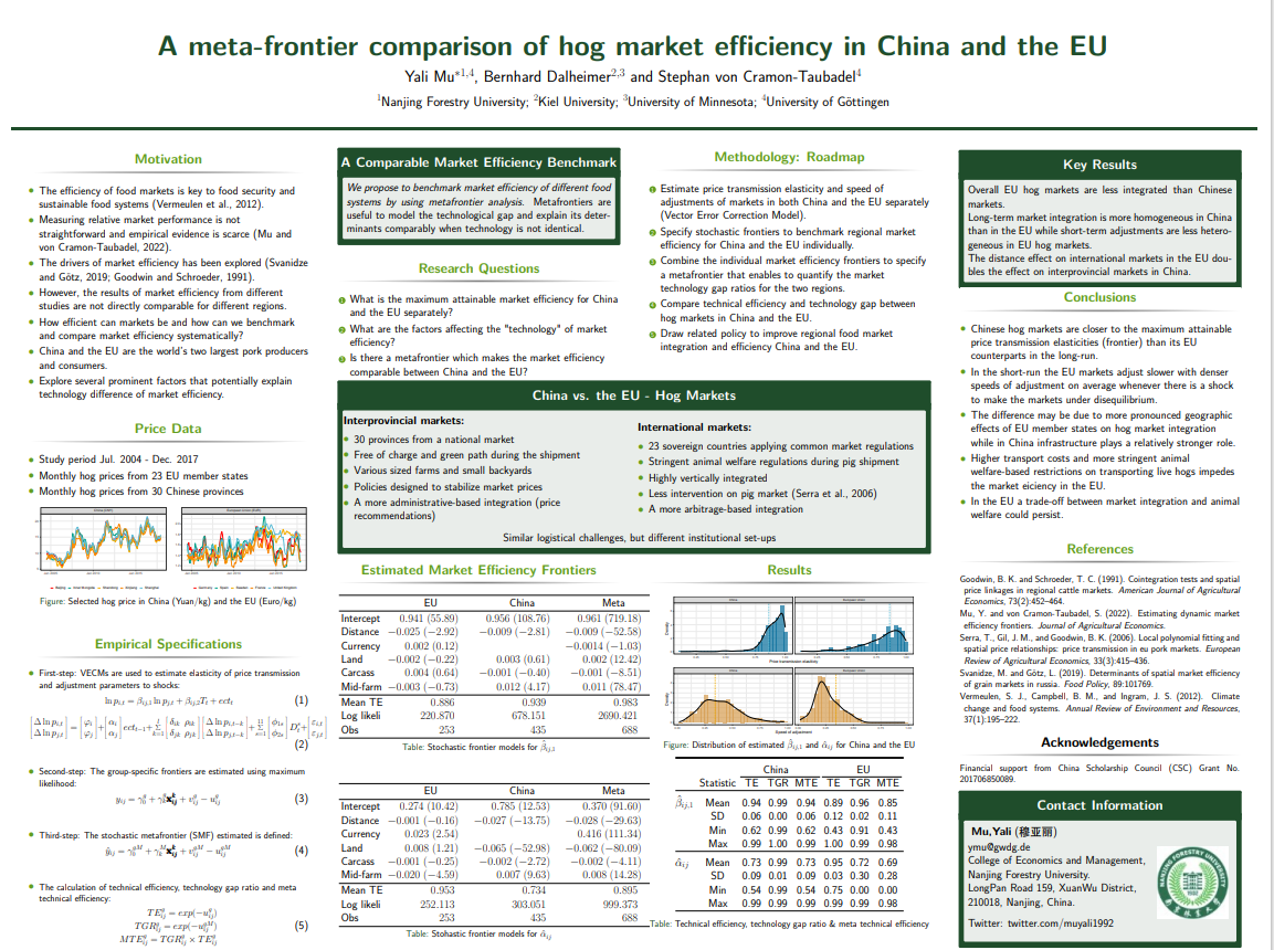 另穆亚丽博士与Bernhard Dalheimer, Stephan von Cramon-Taubadelhe的最新研究——基于共同前沿比较中国与欧盟市场效率于2022年7月31日在加利福尼亚洲安纳海姆(Anaheim)美国农业与应用经济学年会上汇报交流,该研究首次运用共同前沿方法系统地比较了大的经济体之间的市场效率,以期为提高不同经济制度下的市场效率提出政策建议。