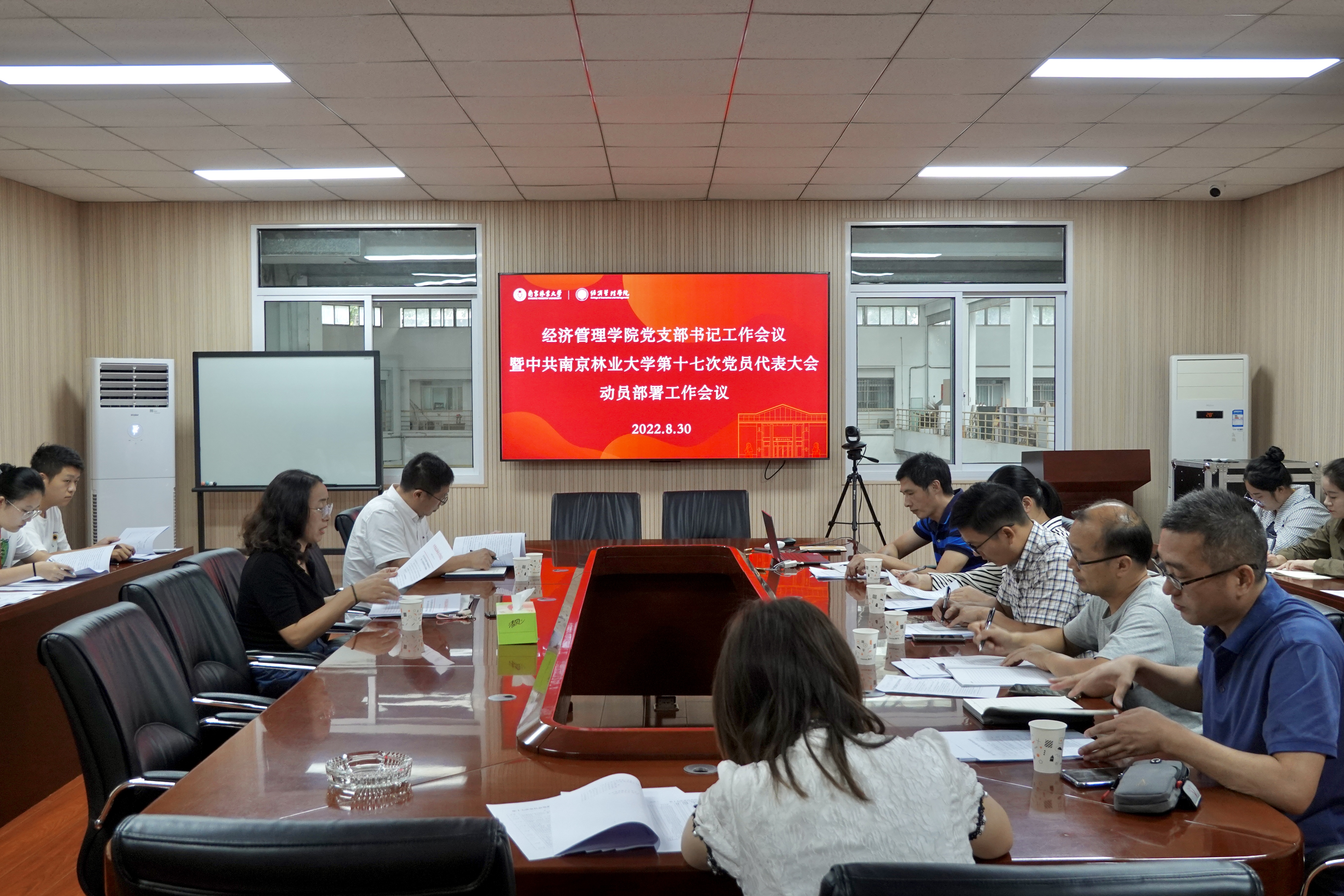 中共南京林业大学第十七次党员代表大会将于9月28~29日召开。为落实校党代会工作安排,8月30日下午,经济管理学院于院楼C208召开了党支部书记工作会议暨中共南京林业大学第十七次党员代表大会动员部署工作会议。经济管理学院党委书记唐萍、党委副书记蔡志敏以及学院各支部书记参加了会议。会议由唐萍书记主持。