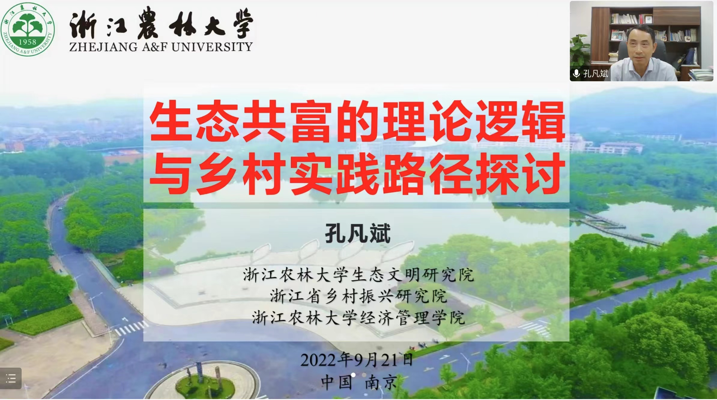 2022年9月21日下午,南京林业大学百廿校庆青山讲堂“第一期”在线上召开。浙江农林大学孔凡斌教授应邀为我院师生作题为“生态共富的理论逻辑与乡村实践路径探讨”的学术报告。院长杨红强、副院长高强及部分师生代表共三百余人参会,会议由高强副院长主持。
