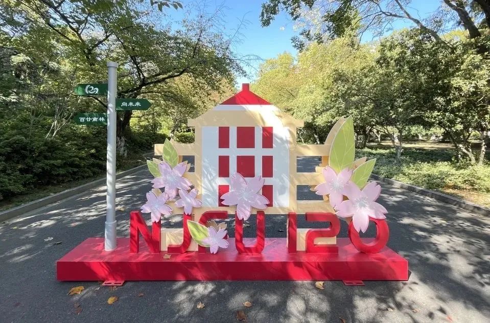 在校园的各个地方,中国红与南林绿交织出喜庆古朴的氛围,校徽与校训的融合,既大气又动人,展现出盛会荣光。