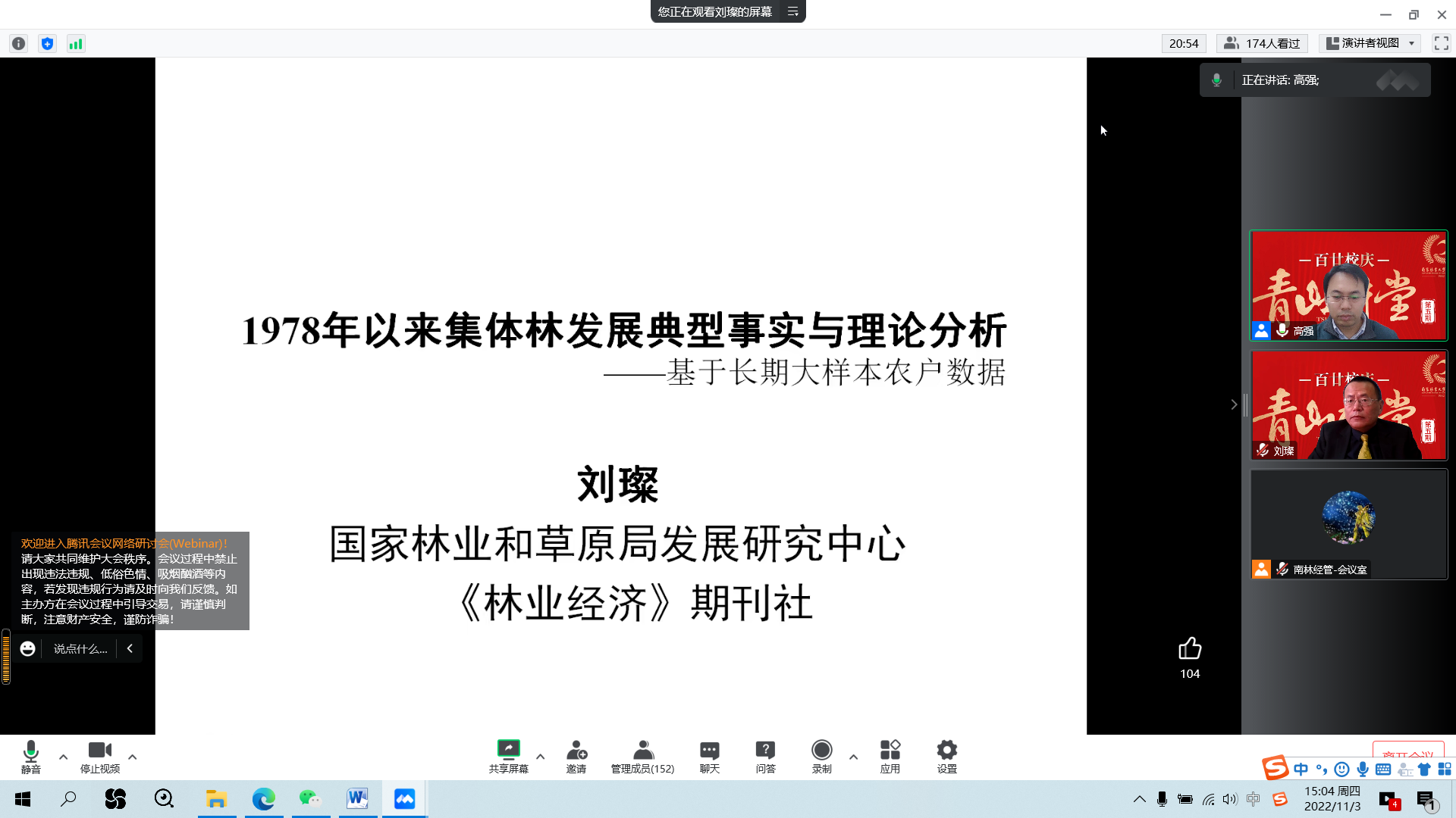 会上,刘璨教授首先强调了我国集体林经济的重要性,并通过大量详实的调查数据描述了基于超过30年跟踪调研数据的南方集体林产权及社会经济动态变化情况;内容涵盖土地产权结构、集体林权变动形式和变动频率、户均林地和耕地资源的对比变化、户均收入的数量和结构变化、户均及单位面积林业投资和投劳的变化、林业收入及其所占比重变化等。与此同时,刘璨教授也结合经济增长和市场化改革的大背景,讲述了集体林改革发展的事实与政策脉络,并结合二十大报告阐释了未来集体林业经营活动的发展方向,并对数字经济与集体林发展、数字经济赋能产业实体经济、林业多重转型等内容进行了重点分析。他特别强调,林业多重转型是市场化改革、国家政策制度和其他外部因素作用的综合结果,是精心设计改革与自发演变的混合体。