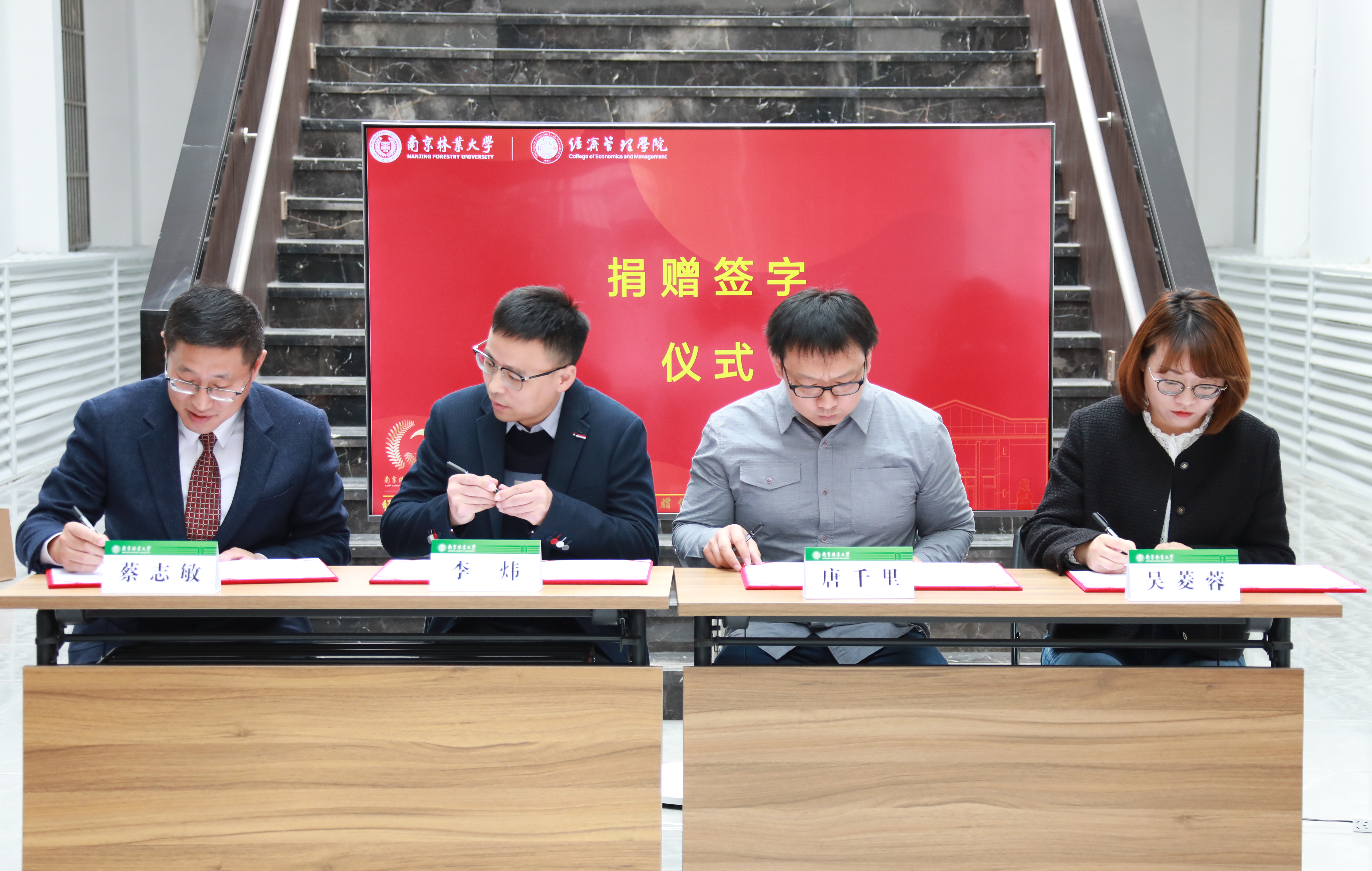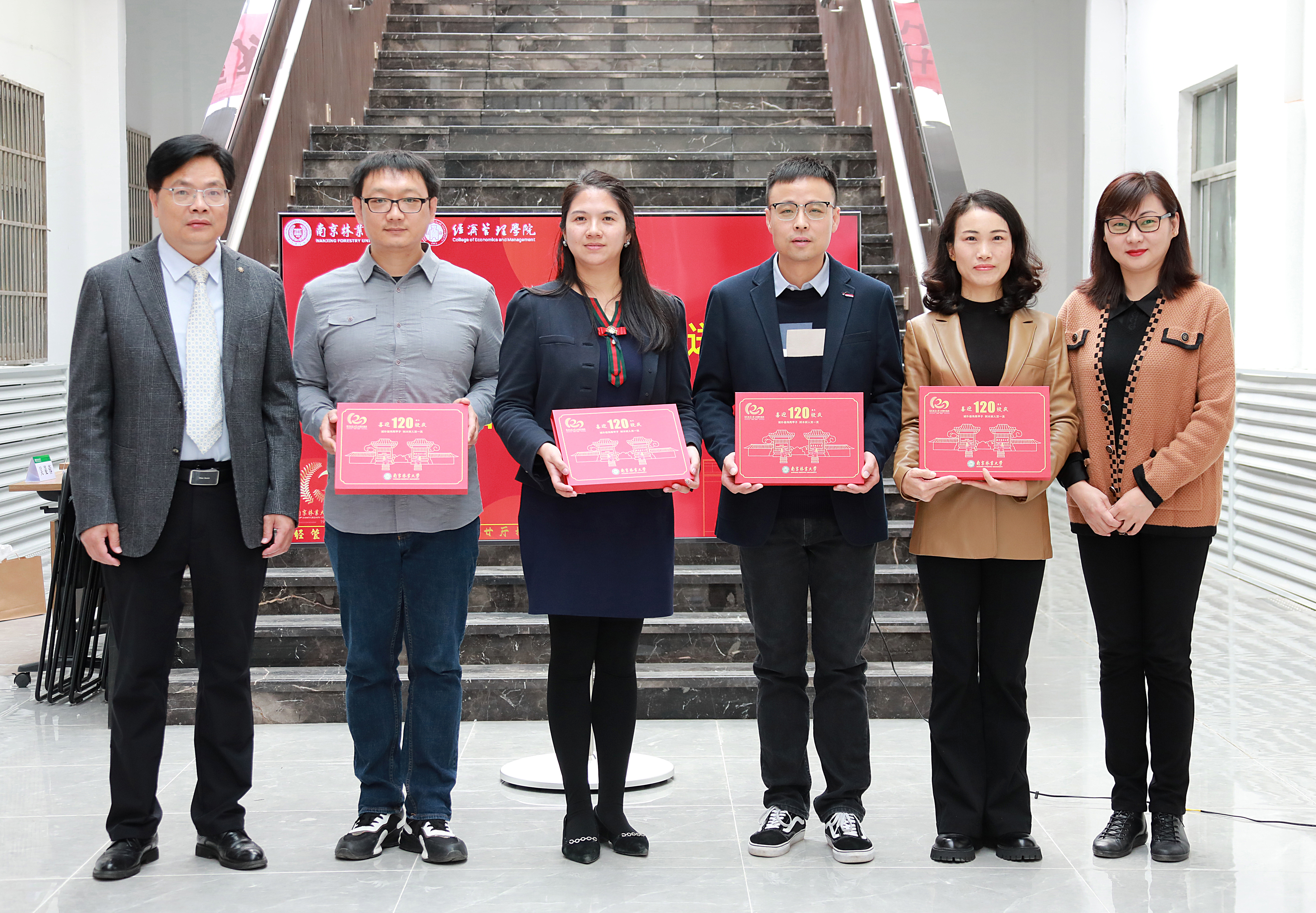 组织部部长、校庆办公室主任赵晶,宣传部部长农春仕为校友代表赠送了纪念品。国资处处长吴菱蓉,经管院副书记、副院长蔡志敏与校友代表唐千里、李炜共同签订“百廿厅”捐赠协议。