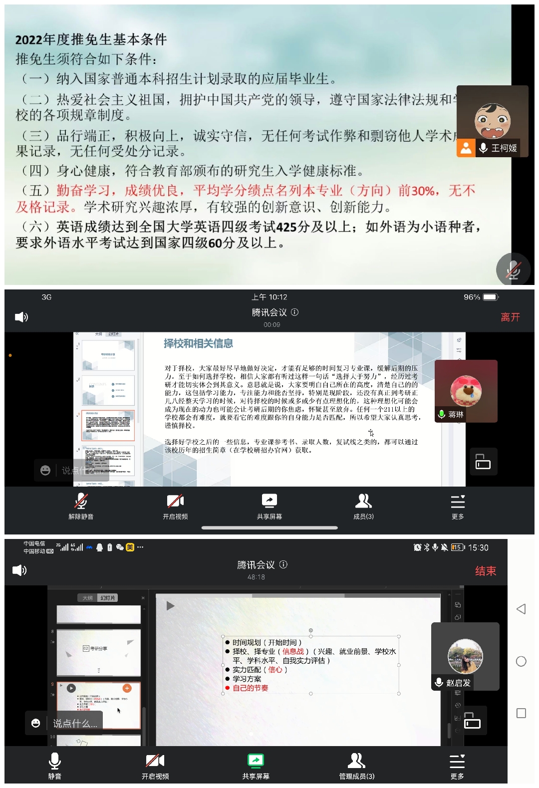为了帮助22级新生了解升学形势、明确发展方向、做好学业规划,我院于2022年11月3日-11月11日,以线上线下相结合的方式成功举办优秀学子经验交流会,发挥朋辈榜样引领作用。学院特邀19级保研成功同学8人、18级考研成功同学7人,与22级全体同学分专业进行学习交流。
