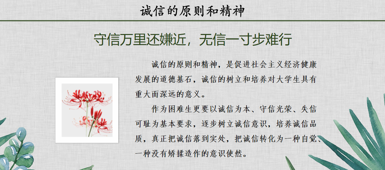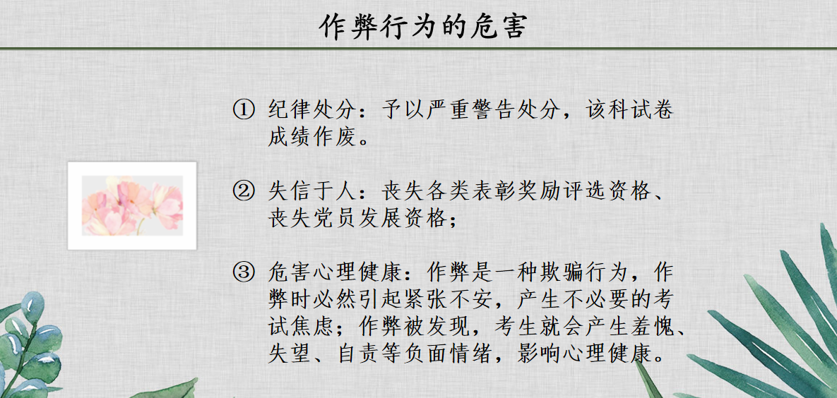 宣讲会第二部分,冯老师援引名言“守信万里还嫌近,无信一寸步难行”,叮嘱受助同学,须以诚信为本,守信为荣,失信为耻,真正把“诚信”刻在心底,落到实处,并将其内化为自觉的意识,践行在学习和生活的方方面面。冯老师以各项违反受助学生日常行为规范或有悖诚信行为作为反面案例,告诫同学们注意日常行为和诚信待人,并指导大家“如何花好受助这笔钱”,将受助资金用在学习上,用在实处。最后,冯老师也着重强调,随着期末考试日益临近,提醒同学们注意考风考纪,诚信考试;与此同时,结合《学生手册》相关内容,也列出了一些常见的作弊行为及其后果,提醒受助同学们更应“行之以德,严守考纪”,着重强调诚信考试的重要性,要求学生拒绝作弊、诚信迎考。