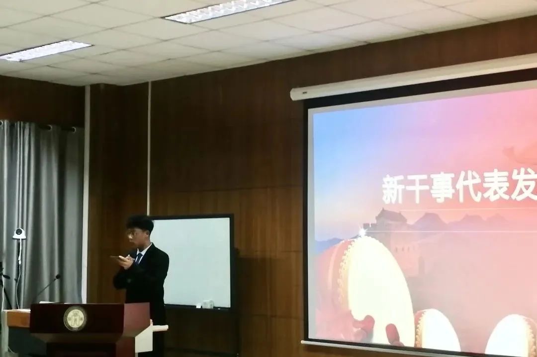新干事代表张天睿同学上台发言。他表示,从最初的憧憬学生会到后来的加入学生会、深入了解学生会,他见证了学生会在学院各项工作中的重要作用。他和新干事们都将不断提升综合素质,以求实、创新的态度做好本职工作,服务好师生,树立良好的形象风貌,为学院发光发热,贡献力量。