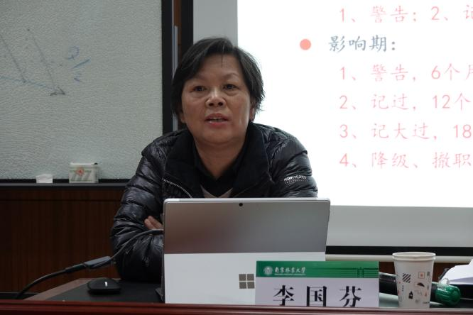 2022年12月1日下午,经济管理学院新党员培训班第三讲以线上线下会议的方式在院楼c105顺利举行。本次培训由南京林业大学土木工程学院教授、原校纪委副书记李国芬讲授“涵养清风正气,做一个合格党员”主题党课。党委组织员赵淑颖老师主持,所有预备党员参加。