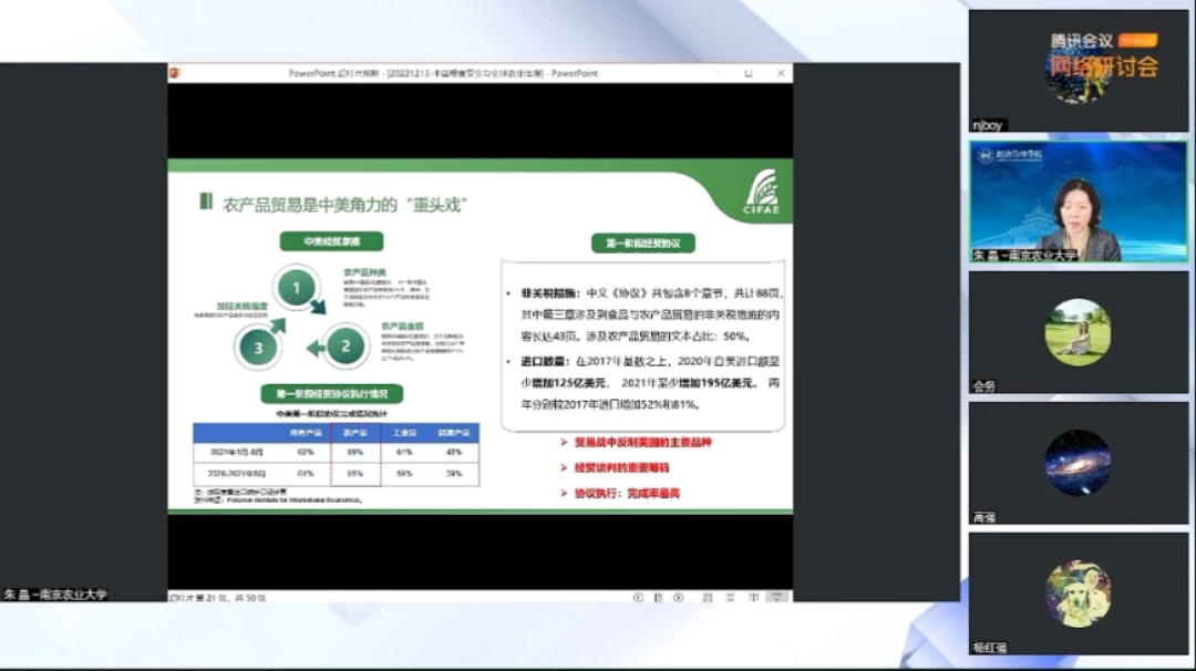 2022年12月14号下午,南京农业大学首席教授朱晶做客我院百年校庆“青山讲堂”,并作题为“中国粮食安全与全球农业贸易治理”学术讲座。院长杨红强、副院长高强及我院部分教师、在读博士和硕士研究生以及在线听众1000余人参加了此次报告会。会议由高强副院长主持。