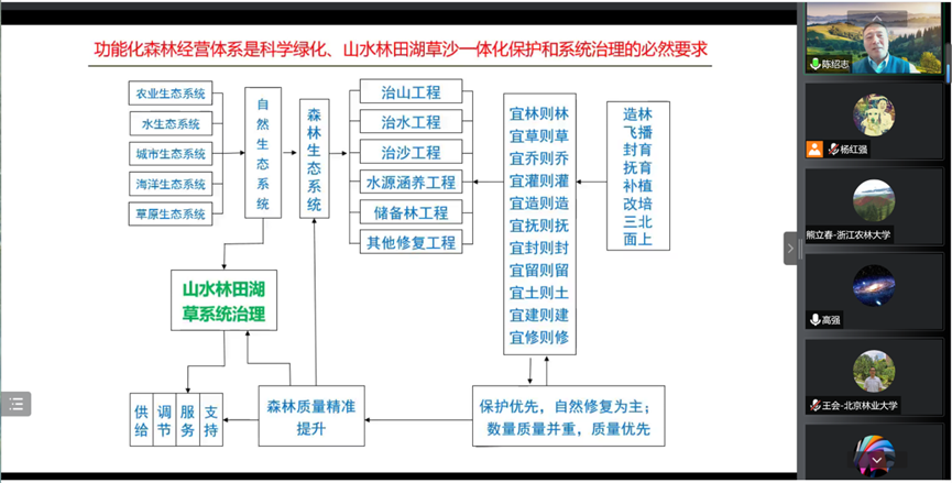 陈绍志教授从党的二十大报告出发,介绍了“森林质量精准提升”的重要性。陈教授的报告指出,森林质量精准提升是习近平生态文明思想的重要组成部分,对于维护国家生态安全、淡水安全、气候安全、物种安全和木材安全和实现中华民族永续发展都具有重要意义。陈绍志教授表示,我国森林提质增效潜力巨大,同时也指出了现有森林,尤其是天然林的经营管理的中突出问题及成因。陈绍志教授在阐明森林质量精准提升、全周期森林经营、近自然森林经营、多目标经营、功能化经营/系统化经营等基本概念体系和理论基础上,强调了向全周期的森林经营的转变需要“三分造七分管”,即重视过程中经营理念和管理技术的转变,与此同时也强调了森林经营目标与措施选择过程中技术运用的差异性。