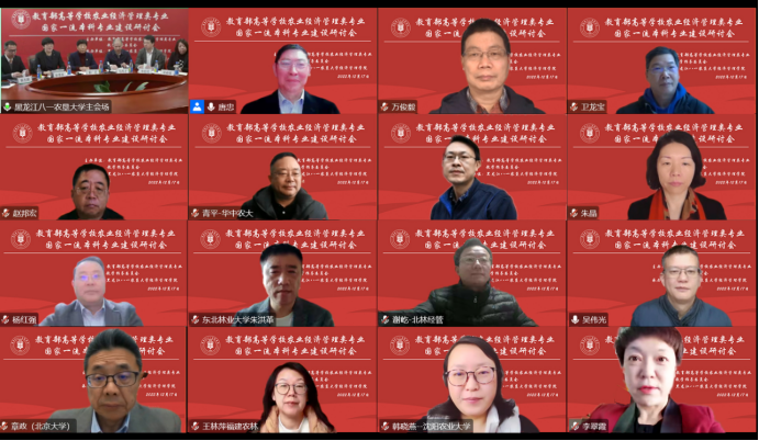 为交流农经专业类国家级一流本科专业建设经验,推进一流专业建设,提高人才培养质量,更好地为实施国家乡村振兴战略培养“懂农业、爱农村、爱农民”的拔尖创新人才,12月17日,由教育部高等学校农业经济管理类专业教学指导委员会(简称农经教指委)主办,黑龙江八一农垦大学经济管理学院承办的“农业经济管理类专业国家级一流本科专业建设第二次研讨会”以在线视频会议的方式举行。会议主要围绕当前“新文科”与“新农科”交叉融合的农业经济管理类本科专业建设问题,聚焦林业院校和东北地区高校一流本科专业建设点展开研讨,为高端农林经济管理人才培养贡献智慧。农业经济管理类专业教指委全体委员、全国高校农业经济管理领域的专业教师代表120多人与会,我院杨红强院长、邓德强副院长和农林经济管理专业教师代表参加了本次会议。