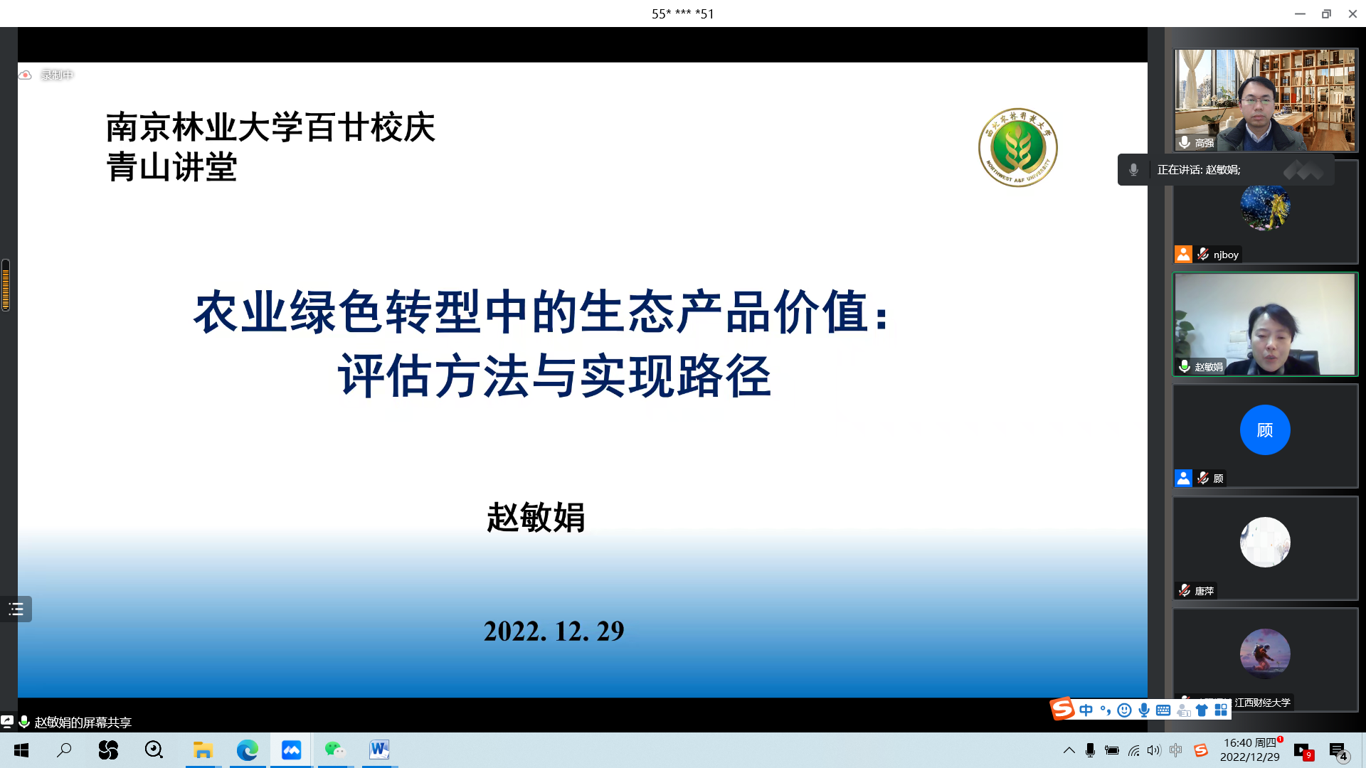 2022年12月29日,西北农林科技大学副校长、教育部长江学者、陕西省中青年创新领军人才、国务院特殊津贴专家赵敏娟教授应邀为我院师生作题为“农业绿色转型中的生态产品价值:评估方法与实现路径”学术讲座。我院部分教师、在读研究生及其他部分学校在线师生1000多人参加了此次线上报告会。