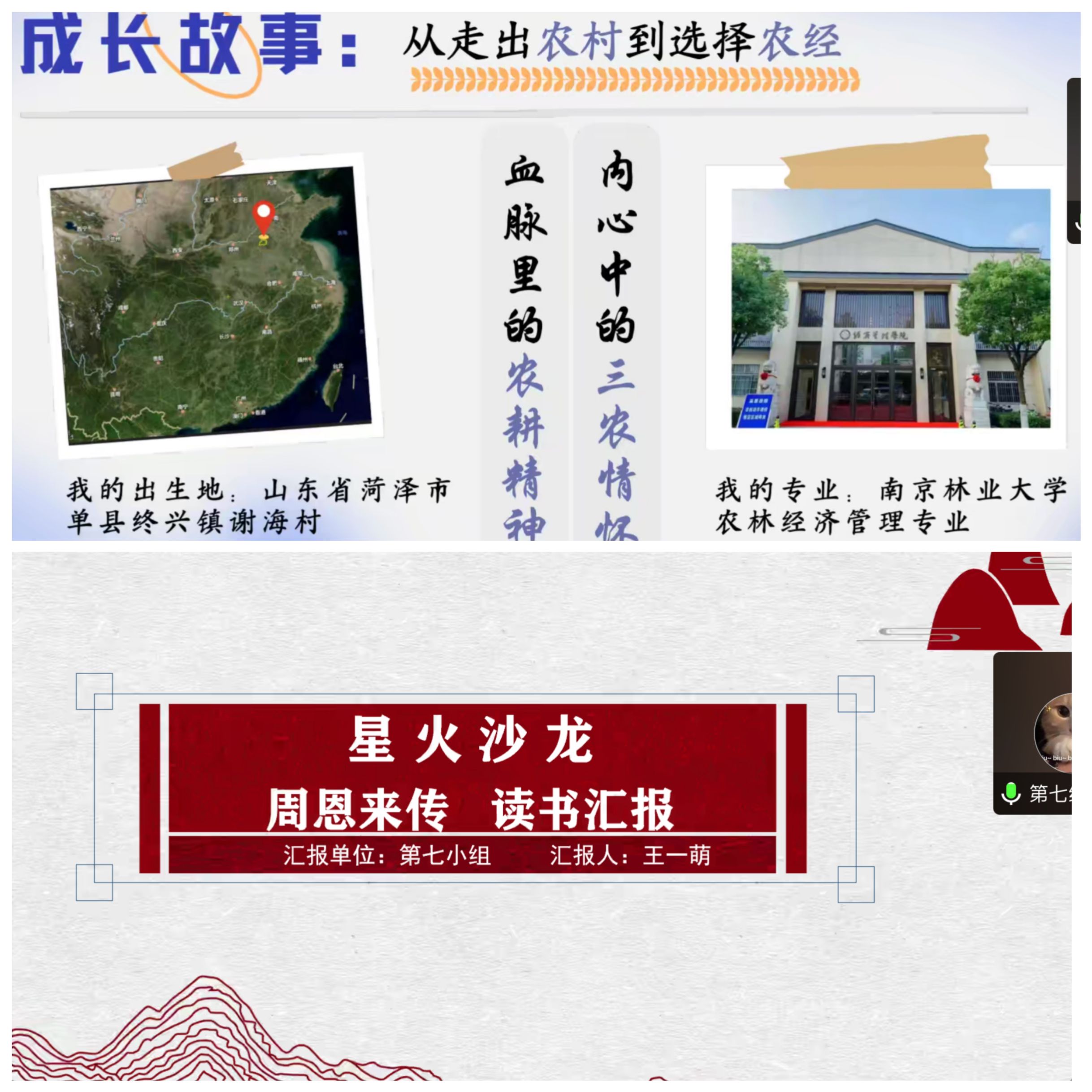 其中,学生党员张义义就自身的成长故事和专业背景,对农经的发展历程进行了介绍。她指出,新时代农经学子应当坚持问题导向,不断发现问题、直面问题、分析问题并解决问题。并呼吁广大党员用行动践行党的二十大精神,到基层的地方去、到人民中去,用脚步丈量祖国大地,用眼睛发现中国精神,用耳朵倾听人民呼声,用内心感应时代脉搏。“周恩来传 读书汇报”主题汇报人王一萌就《周恩来传》一书,重点为大家介绍了书中周恩来在长征中的艰苦奋斗和周恩来在万隆会议上提出“求同存异”方针这两个深刻的故事,她强调了周恩来精神对大学生奉献精神的启示,提出广大青年必须把历史的苦难放在心上,把为中国人民谋幸福为中华民族谋复兴作为自己人生的追求。