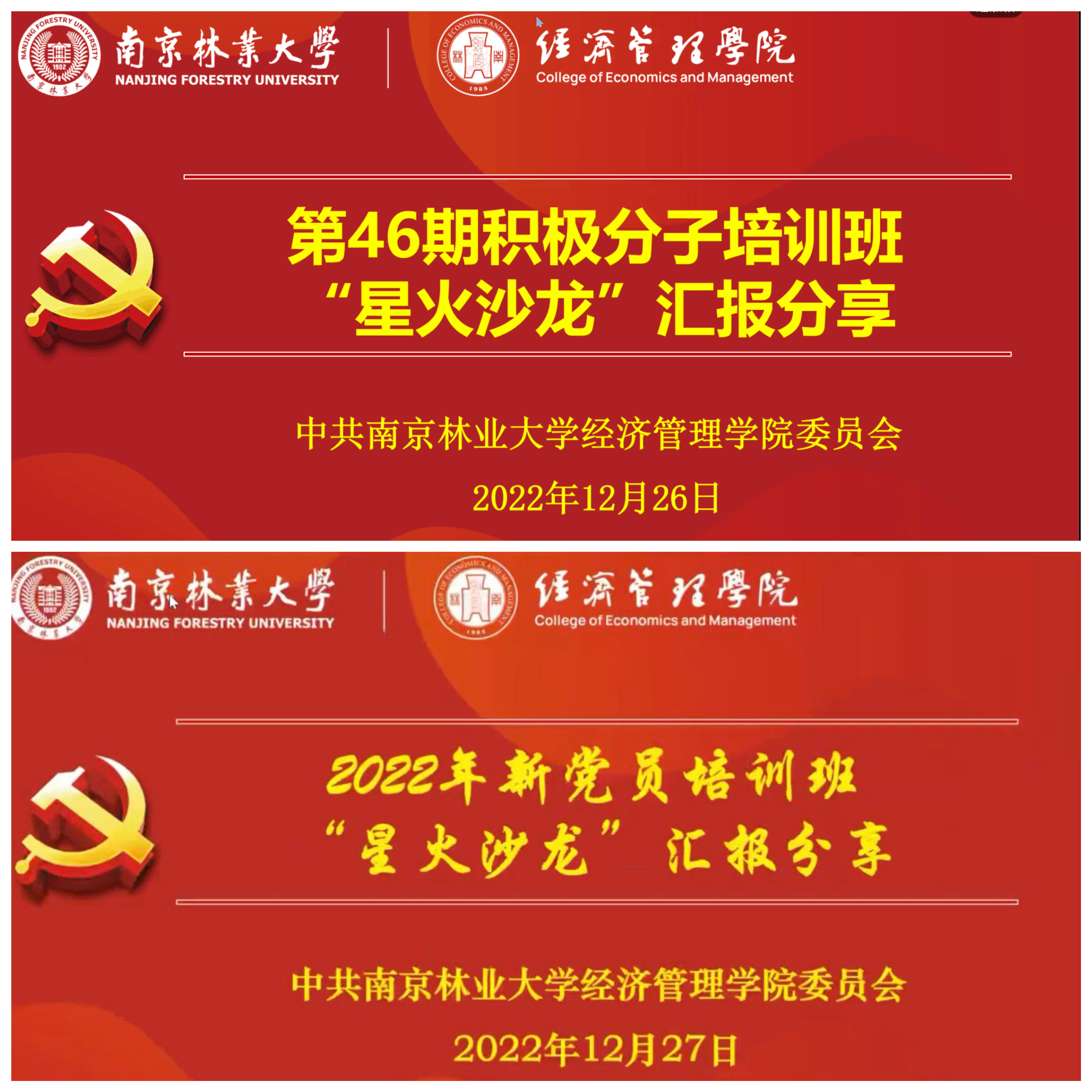 2022年12月26—27日,经济管理学院第46期入党积极分子及2022年新党员培训班“星火沙龙”主题活动在线上顺利举行。本次活动由经济管理学院党务工作中心组织开展,经济管理学院党委组织员、研究生辅导员赵淑颖、学生支部书记代表和经济管理学院46期入党积极分子及新党员参加。24组成员代表围绕“二十大精神 青年发展感悟”自选角度进行汇报。