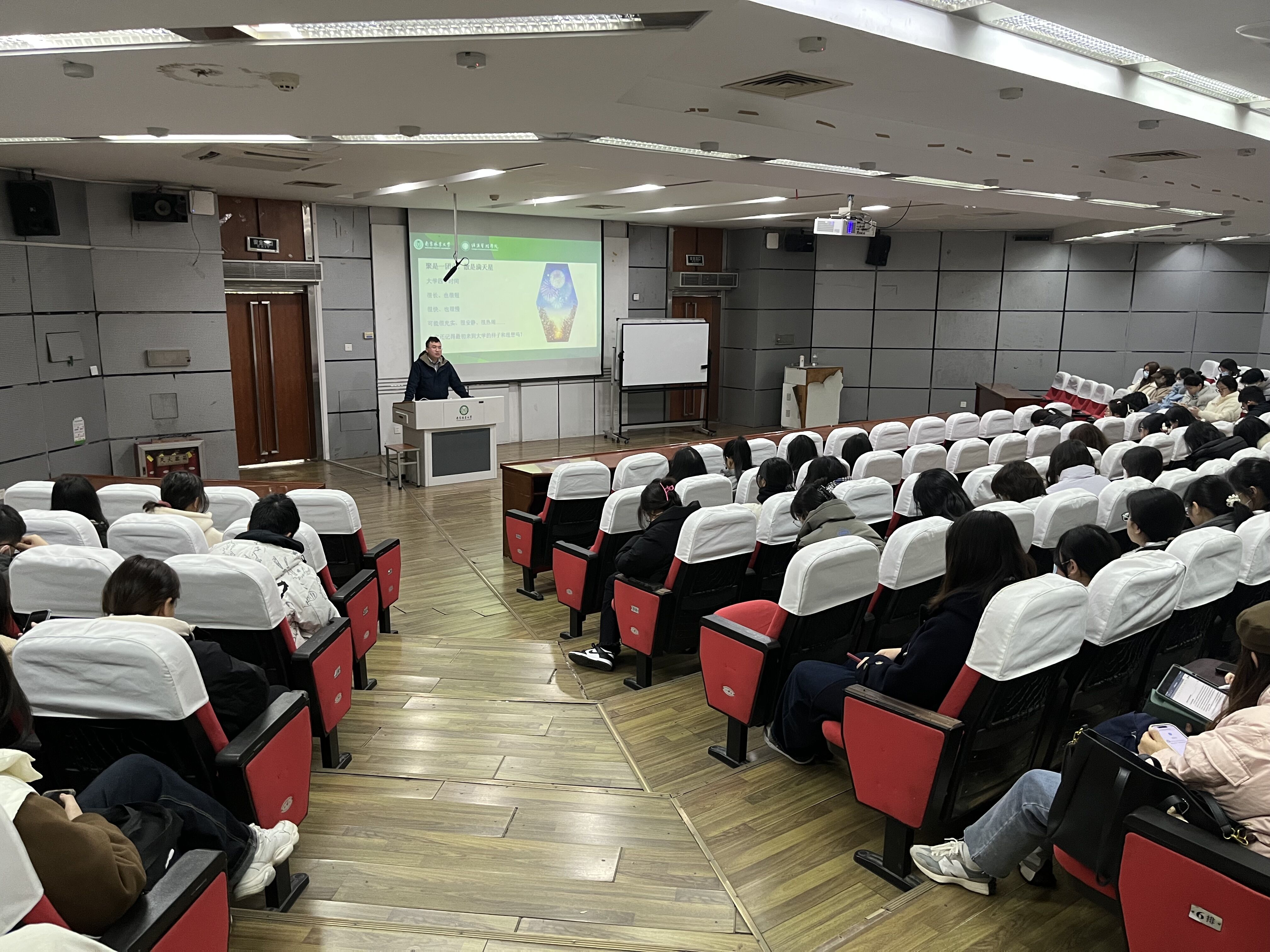 坦然面对结果,积极调整心态。辅导员冯金小老师对顺利通过考研初试的同学表示祝贺,并围绕复试准备和注意事项展开详细讲解。他指出,根据当前形势,今年研究生复试形式较去年可能会发生新变化,提醒同学们应对目标院校的复试信息多加关注,学会整合利用资源,并提前做好准备。随后,向各位同学分享了综合面试的技巧,叮嘱面试时应注意个人礼仪,回答问题时应自信从容,大方得体。同时也希望同学们保持健康良好的心态,积极应对挑战,避免过度焦虑。