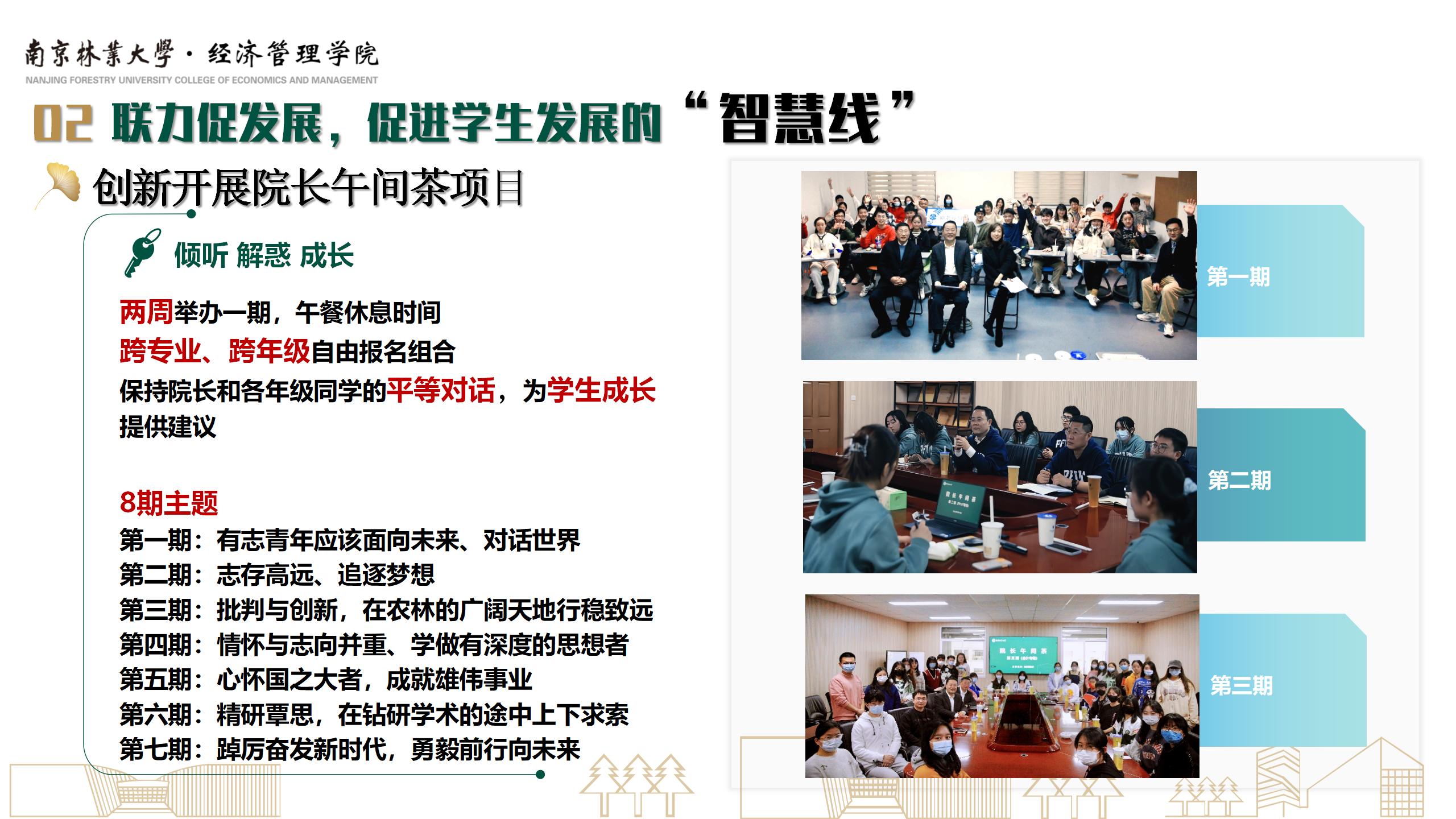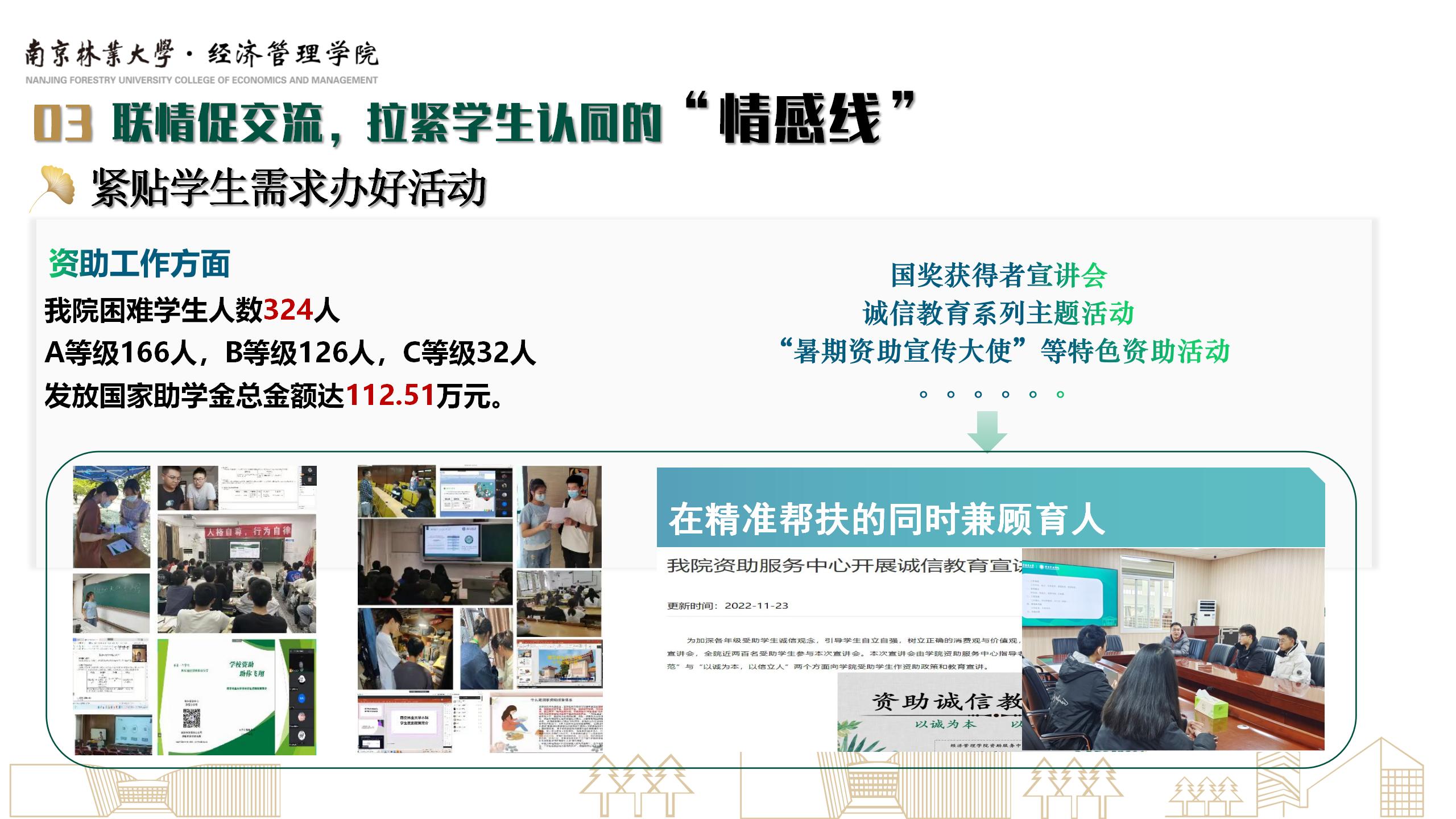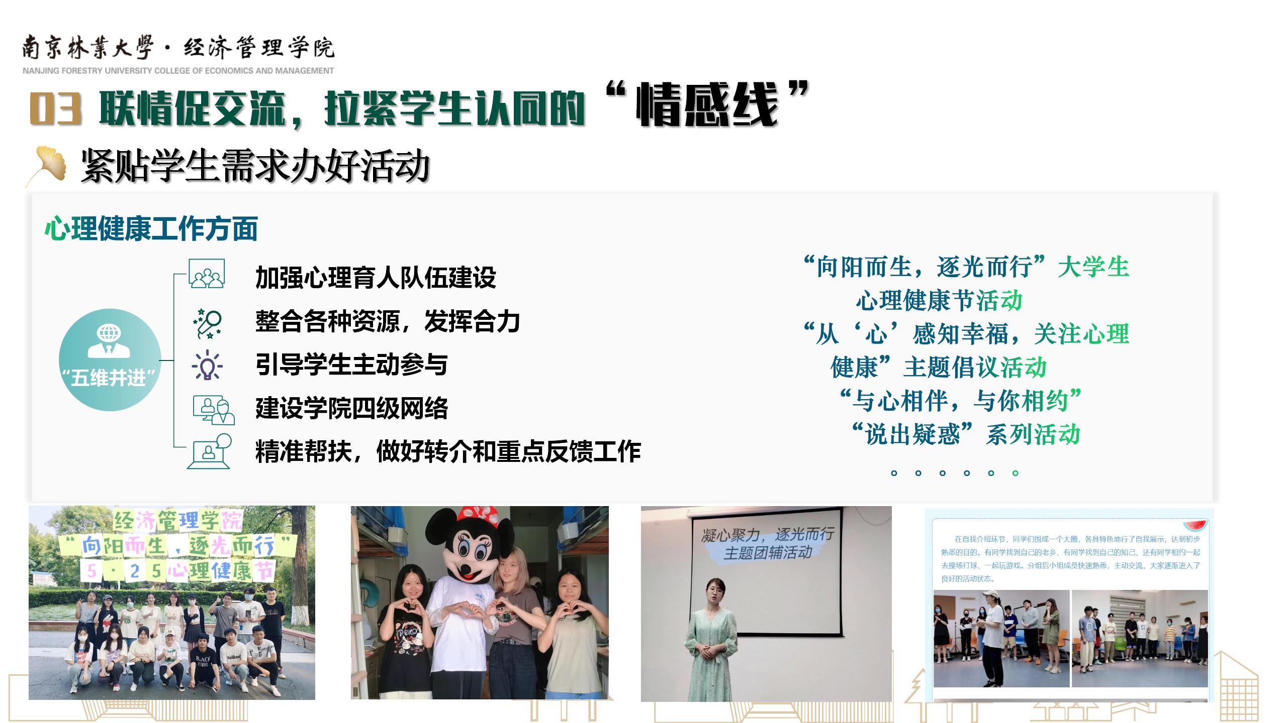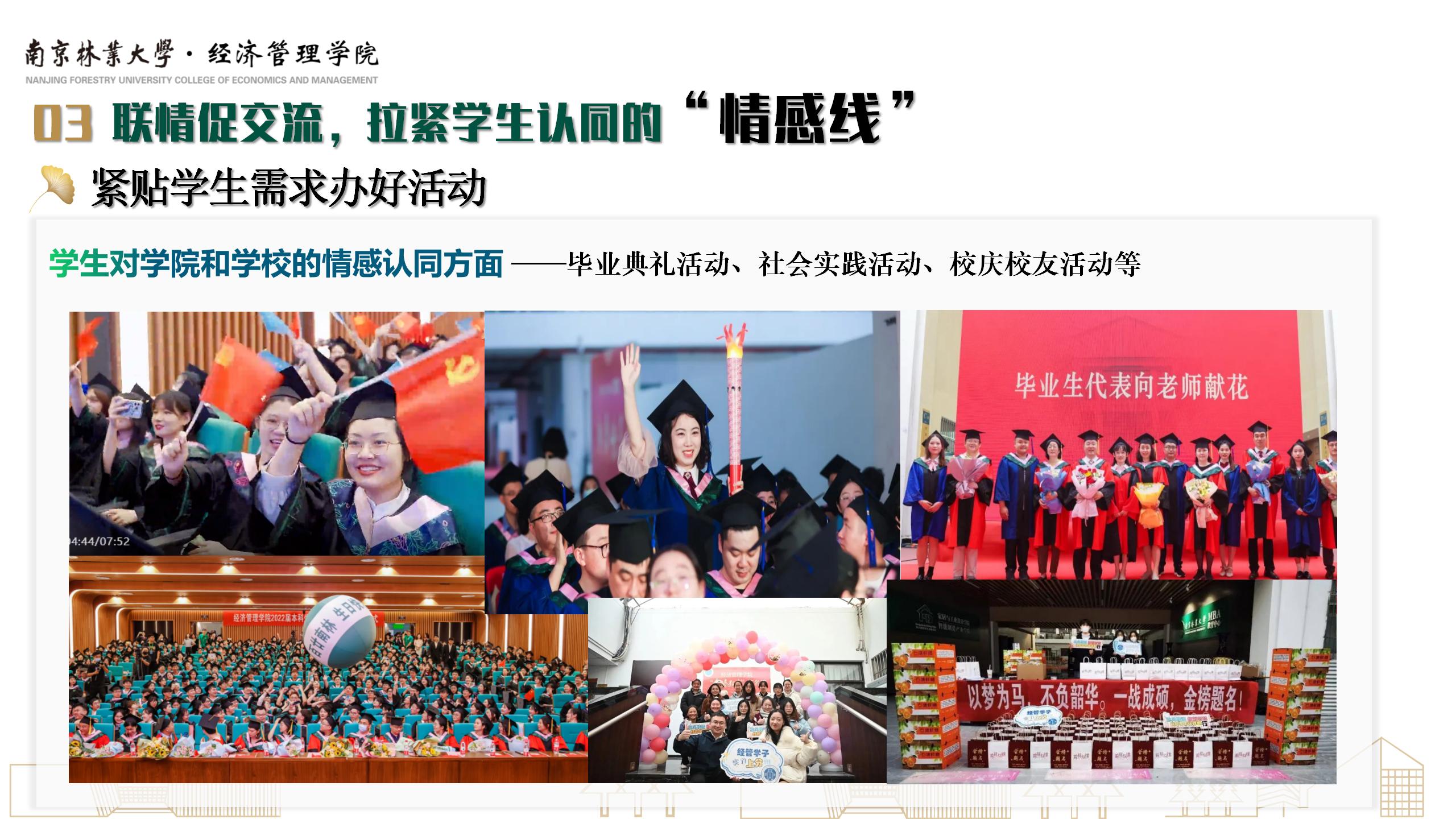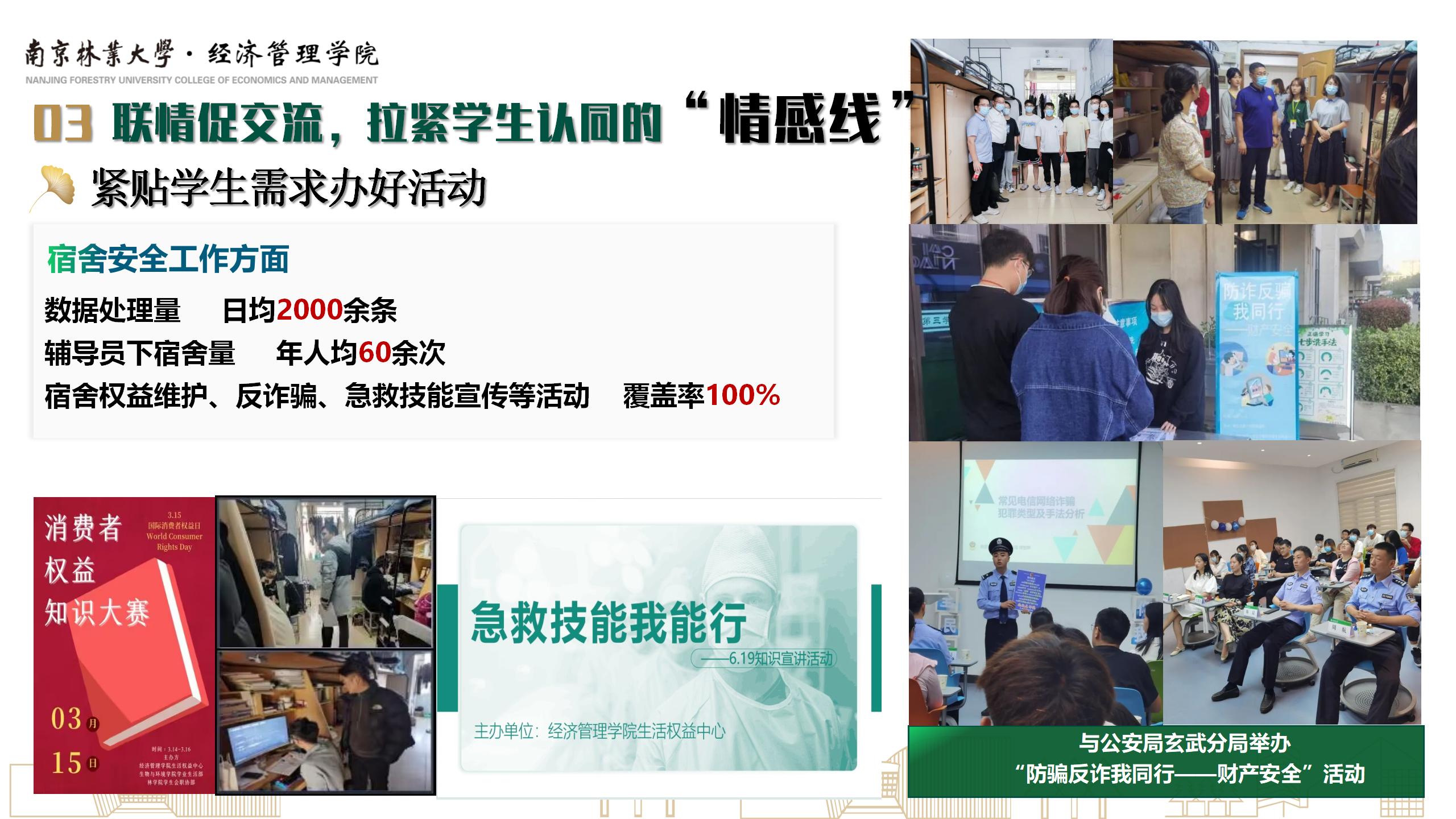这一年,我们联情促交流,拉紧学生认同的“情感线”。学生是我们的服务对象,与他们近一点、再近一点,是我们的服务要求,也是工作方法,因此,我们努力把学生的呼声和需求转化为有干货的各类活动。宿舍工作方面,在全院处理进出宿舍消息日均2000余条的基础上,举办宿舍权益维护、反诈骗、急救技能宣传等活动等。心理健康工作方面,五维并进,在举办“向阳而生,逐光而行”心理健康节活动等普惠性活动的基础上,对学院重点关注学生坚持师生一对一结队帮扶。资助工作方面,在严格落实困难生评定、助学金发放等常规工作的同时,兼顾“育人”的工作原则,开展特色活动。学生走出校园,就是学校和学院的宝贵财富,我们敲破脑袋,精心办好毕业典礼等大型活动,立志让学生无论走到哪里,都能想到在南林有些人、有些事、有些时光,值得他们铭记。
