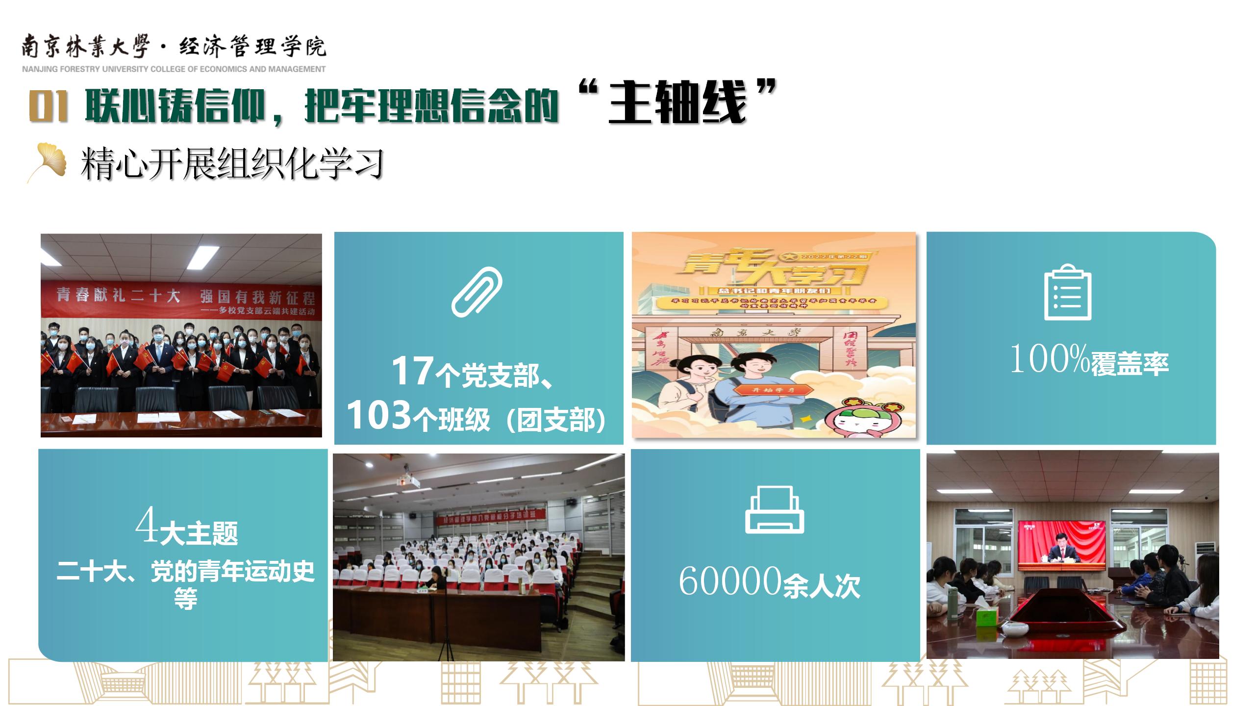 这一年,我们团结奋斗勇争先,联心铸信仰,把牢理想信念的“主轴线”。我们牢牢把握切实增强思想政治引领实效的要求,结合党的二十大召开等大形势、大题材,请年轻辅导员走上讲台讲党史、录团课,让有信仰的人讲信仰,让懂青年的人讲故事,为青年学子植入理想信念的基因。一年面向17个党支部、103个团支部精心开展组织化党日活动和青年大学习,20余次学习活动吸引全院3000余名学生参与,累计学习60000余人次。