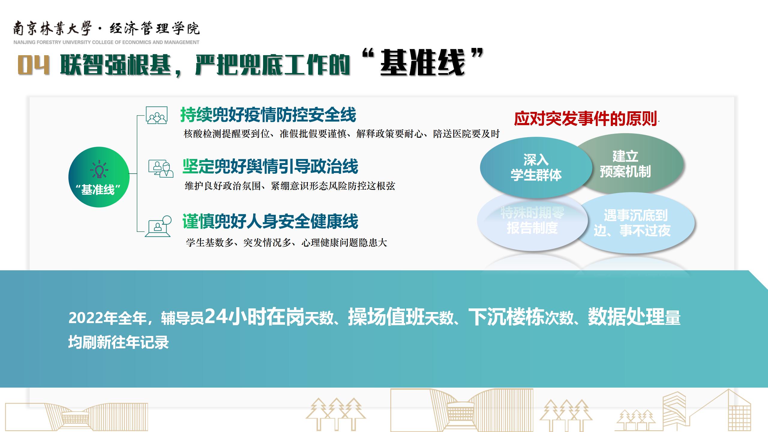 这一年,我们联智强根基,严把兜底工作的“基准线”。要把握住这个基准线,必须坚定兜好疫情防控安全线、坚决兜好舆情引导政治线、谨慎兜好人身安全健康线,这要求辅导员用时间去坚守、用耐心去化解、用工作机制去保障。2022年全年,辅导员24小时在岗天数、操场值班天数、下沉楼栋次数、数据处理量均刷新往年记录。