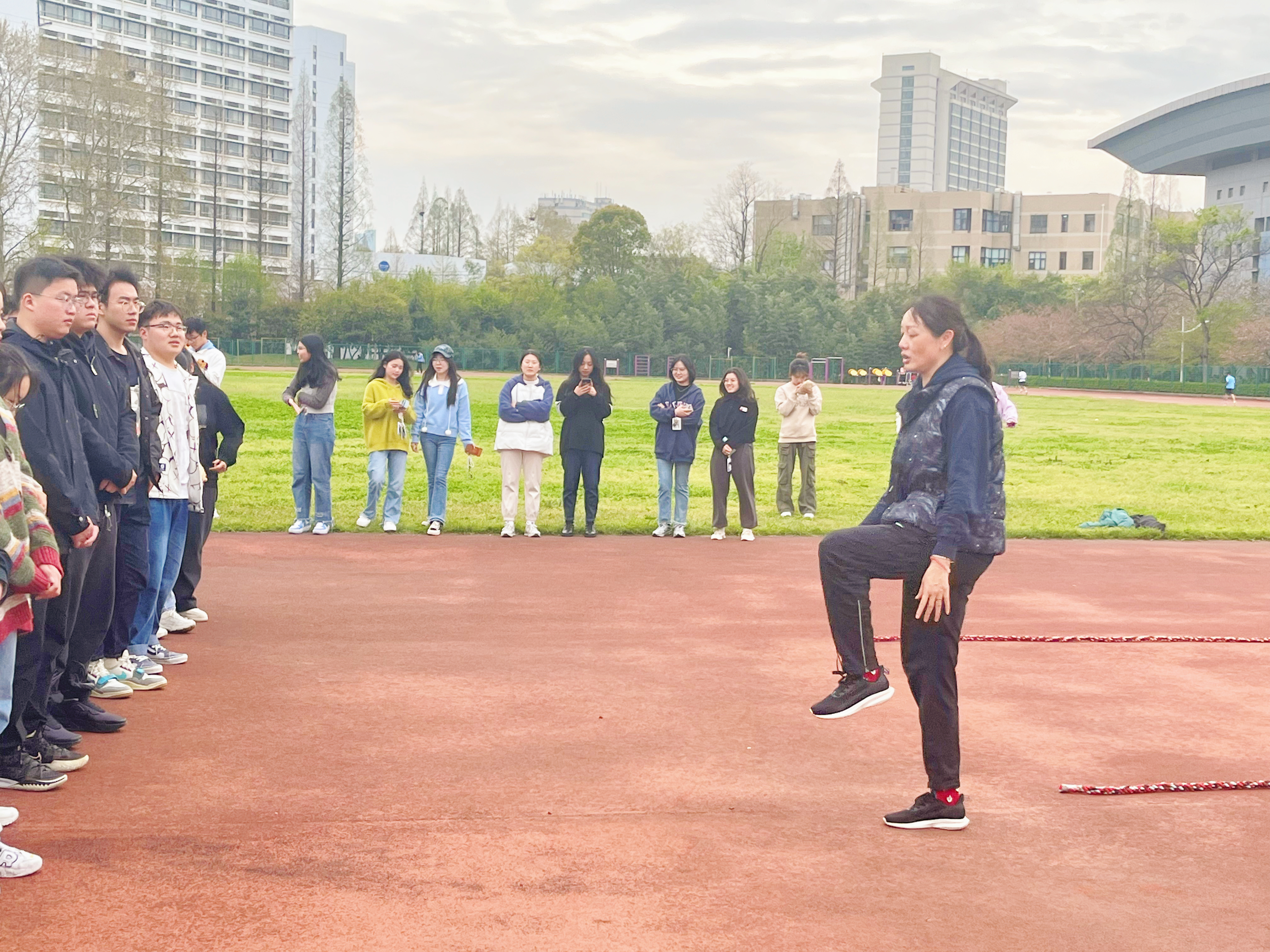 在热身准备阶段,学校体育部周洁老师为同学们讲解拔河比赛中的注意事项和具体规则,带领同学们做赛前准备活动。