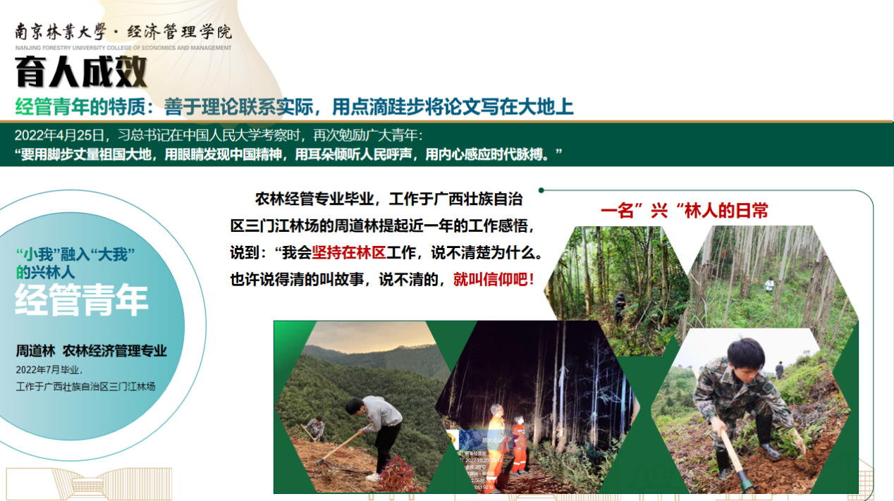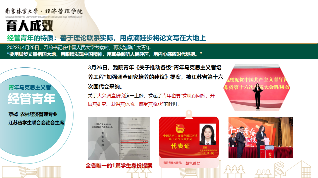 2022年4月25日,习总书记在中国人民大学考察时,再次勉励广大青年:“要用脚步丈量祖国大地,用眼睛发现中国精神,用耳朵倾听人民呼声,用内心感应时代脉搏。”作为文科专业的青年,一年来,学院青年争做起而行之的行动者,将“善于理论联系实际,用点滴跬步将论文写在大地上”的特质继续发扬,在青春的赛道上跑出“经管姿态”。今年3月26日,在两会刚闭幕之际,省学联驻会主席、学院学生覃棹发起了青年也要“发现真问题、开展真研究、获得真体验、感受真收获”的呼吁,作为全省唯一学生身份作者,其《关于各级青马学员加强调查研究能力培养的提案》被江苏省第十六次团代会纳入;4月10日,张浏浏同学在b站发布了他的第二篇原创作品《一个年轻人和他的梦想——2022,我的22岁》,比起点击量,一个年轻人在困境下自信自强、刚健有为的风貌更让人自豪;4月下旬,“小我”融入“大我”,赴广西林场工作的周道林向学院报到,用图片分享了经管青年作为新时代“兴林人”主动走进乡土中国深处“自找苦吃”的青春风采。这一年,经管青年还围绕民生实事、“两山双碳”等接续调研,在街巷田间记录一手资料,体悟专业收获,其中“民生调查”社会实践项目,5名经管学生参与执笔的调研报告获党中央、国务院领导重要批示,13名学生获“2022年中国民生调查优秀调查员”。