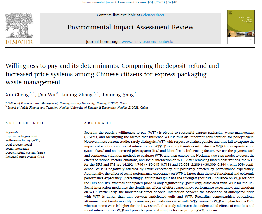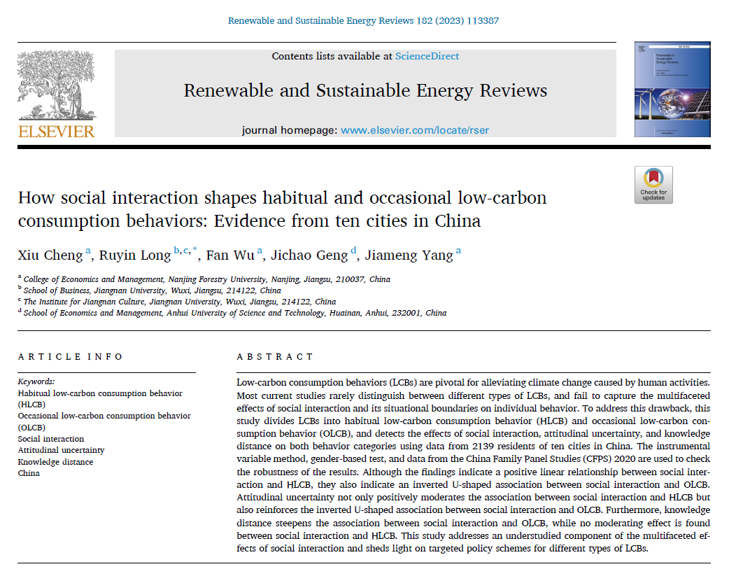 近日,我院程秀副教授作为第一作者撰写的学术论文“How social interaction shapes habitual and occasional low-carbon consumption behaviors: Evidence from ten cities in China”和“Willingness to pay and its determinants: Comparing the deposit-refund and increased-price systems among Chinese citizens for express packaging waste management”分别在环境科学领域权威期刊Renewable and Sustainable Energy Reviews(SCI中科一区,Top期刊,IF=16.799)和Environmental Impact Assessment Review(SSCI中科一区,Top期刊,IF=6.122)在线发表。