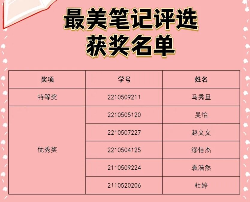 本次活动共有五十余人报名参加,经过激烈角逐,有六位同学的笔记脱颖而出。同时本次评选活动也鼓励了我院学生保持学习热情,养成良好的学习习惯,从而提高学习成绩,发挥宿舍榜样力量。