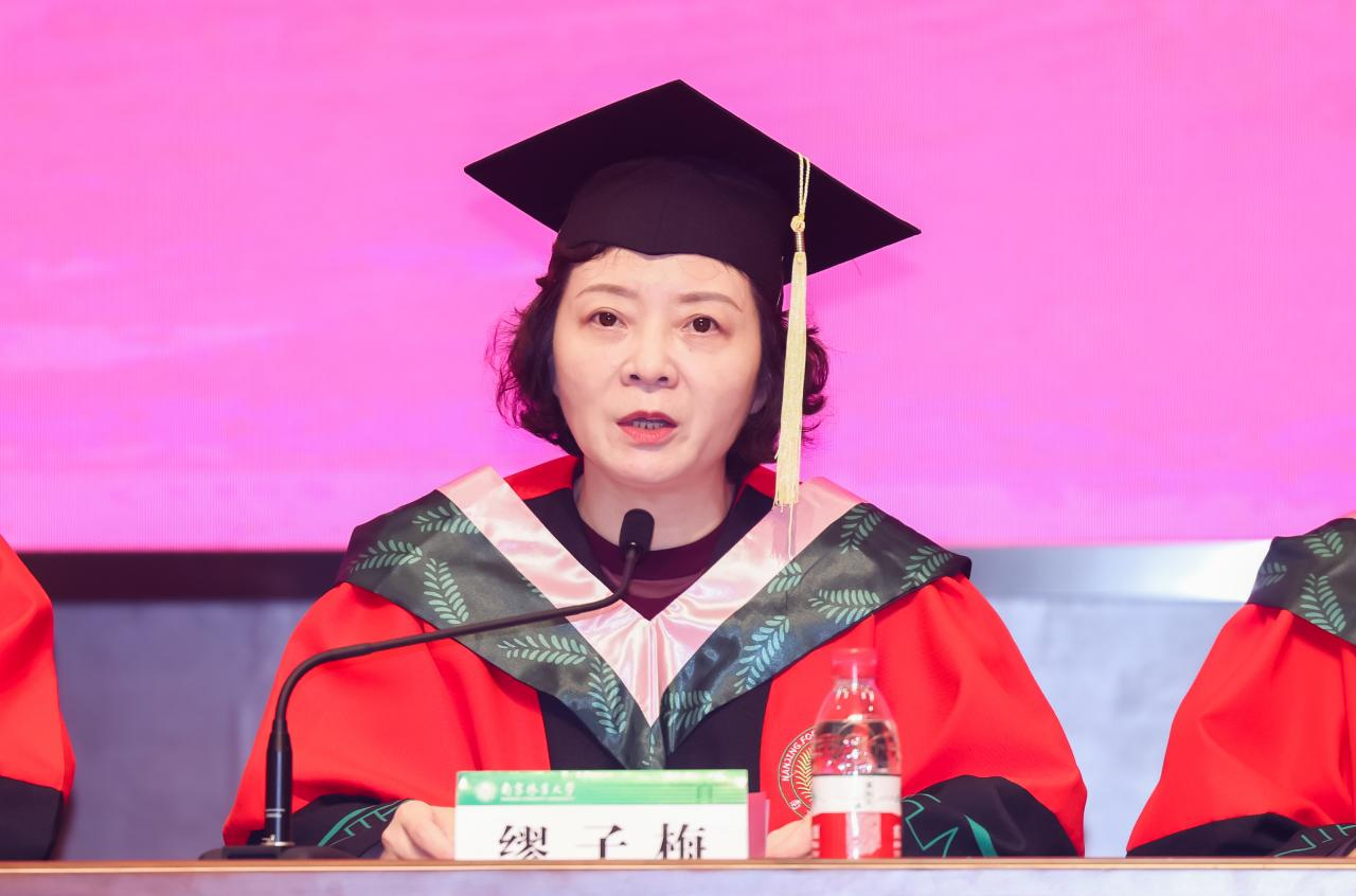 伴随着庄严的国歌声,毕业典礼正式开幕。南京林业大学党委常委、副校长缪子梅发表讲话,“你们是南林事业发展的亲历者。2019年,大家在‘双一流’建设中奋勇逐梦;2020年,在同心抗疫中砥砺前行;2021年,林钟声声,南林重回全国百强高校名单;2022年,再续华章,我们迎来南京林业大学120周年华诞。在这四年的时间里,你们参与了南林砥砺奋进的新征程,增添了南林挺进百强的硬实力,丰富了青春的内涵、收获了沉甸甸的硕果。”缪子梅对同学们顺利完成本科学业表示祝贺,并提出三点殷切希望:第一,希望同学们坚守家国情怀,把握时代脉搏,与祖国同呼吸、共命运;第二,希望同学们坚守绿色发展理念,担当使命,推动可持续发展;希望同学们坚守初心理想,热爱生活,创造美好人生。