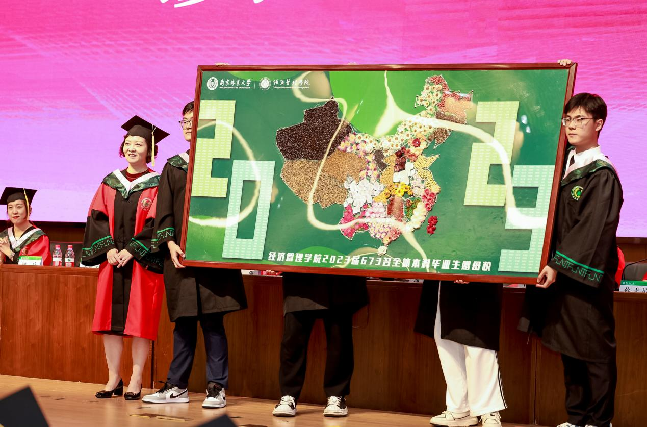 各班代表向2023届毕业班辅导员和班主任献花,表达了同学们对老师的深深感激。2023届辅导员谢冰清、冯金小和毕业生代表表演《一颗种子》主题节目,在歌声中与毕业生们一起重温在南林求学岁月的美好回忆,期望同学们能做一粒好种子,在祖国的大地上茁壮成长,绽放属于自己的青春之花。在毕业之际,毕业生们对母校也是满载着情谊和不舍,他们制作了一副种子地图作为赠送给母校的礼物,地图由673名本科生名字以及来自全国各地的种子组成,汇聚成“2023”字样以及中国地图的图案。