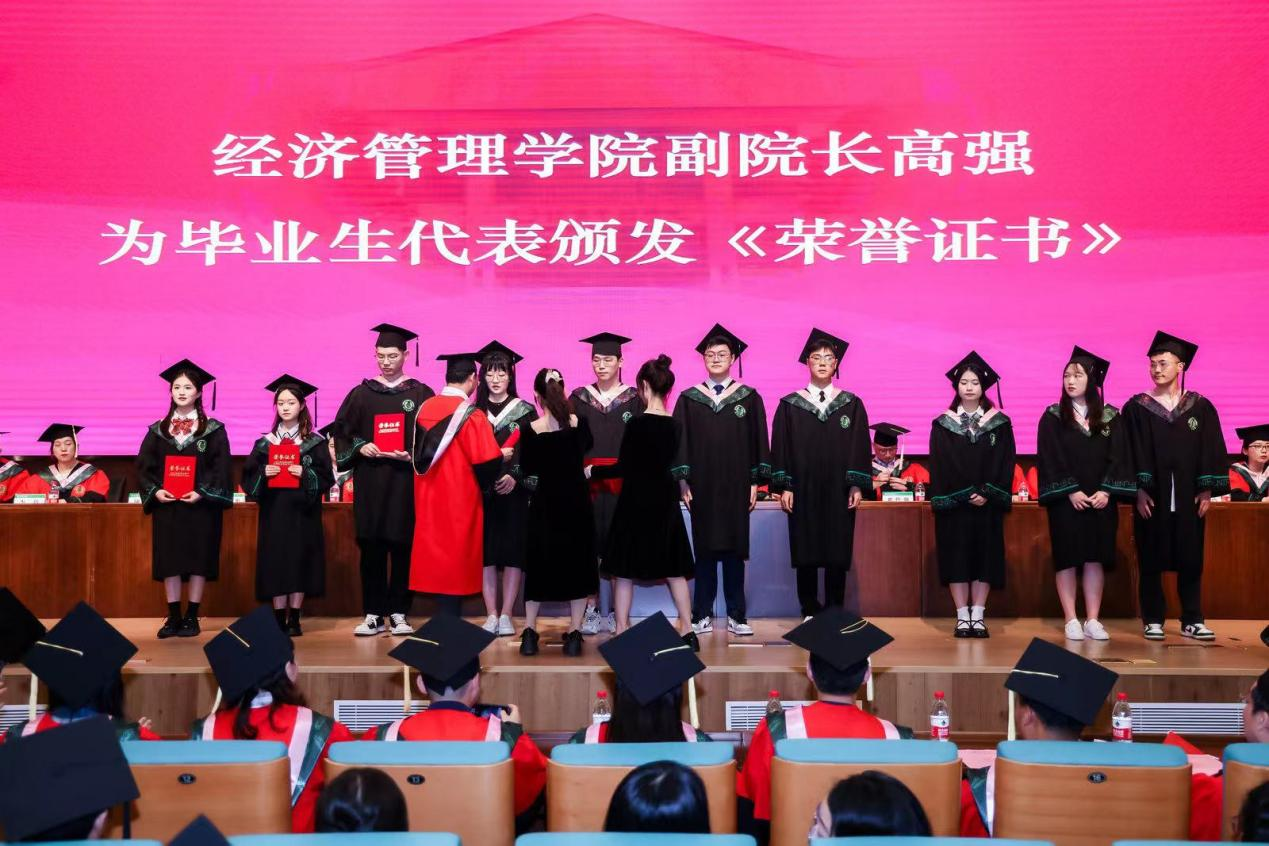 经济管理学院党委书记唐萍宣读《关于表彰经济管理学院2023届“优秀毕业生党员”的决定》,授予曹淑雯等70名学生“优秀毕业生党员”荣誉称号;经济管理学院副院长高强为升学、基层就业、PFUT一期学员等毕业生典型代表颁发《荣誉证书》。