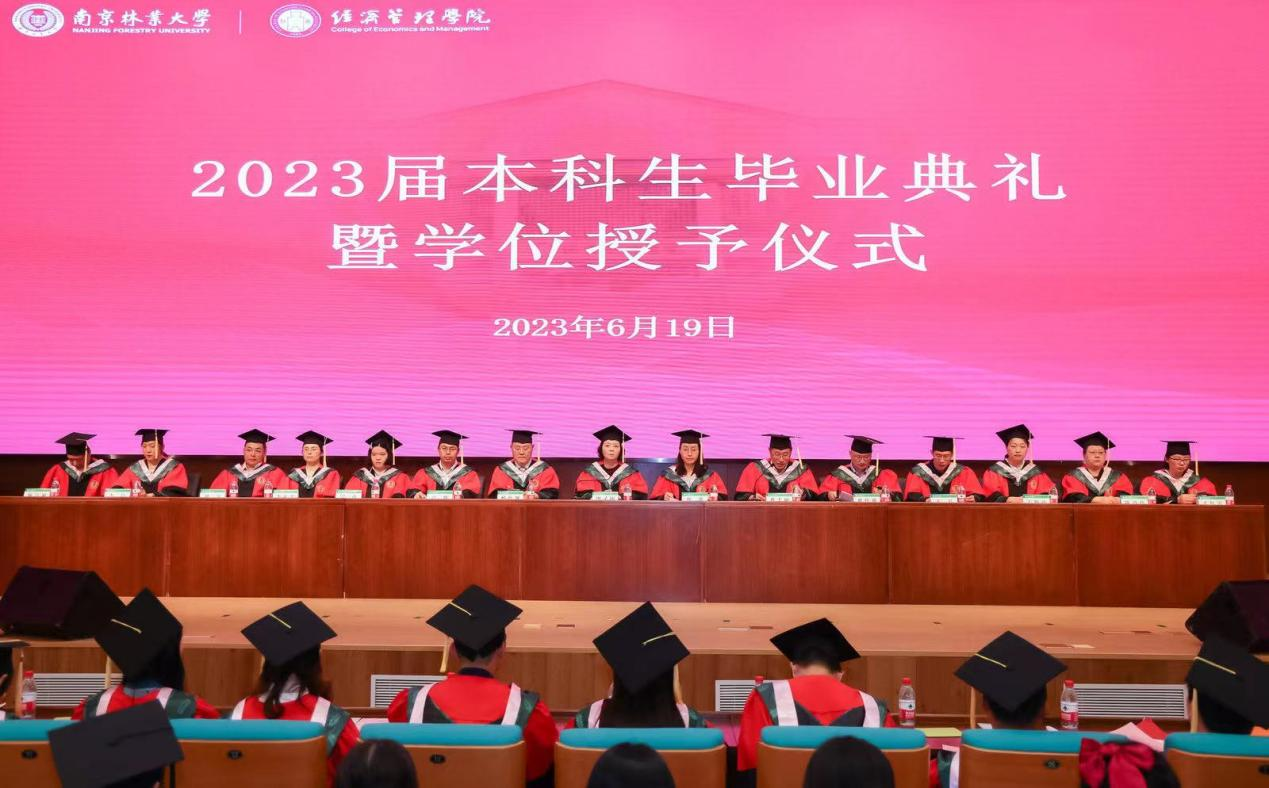 6月19日,南京林业大学经济管理学院2023届本科生毕业典礼暨学位授予仪式在新图书馆举行。南京林业大学党委常委、副校长缪子梅,经济管理学院党委书记唐萍,学院院长杨红强,党委副书记、副院长蔡志敏,副院长高强,副院长邓德强,各系系主任,办公室主任,团委书记、学生工作办公室主任,教学中心主任,实验中心主任,各年级辅导员,毕业班班主任,家长代表,673名本科毕业生及50名2020届本科生代表出席本次盛会。仪式由学院党委副书记、副院长蔡志敏主持。