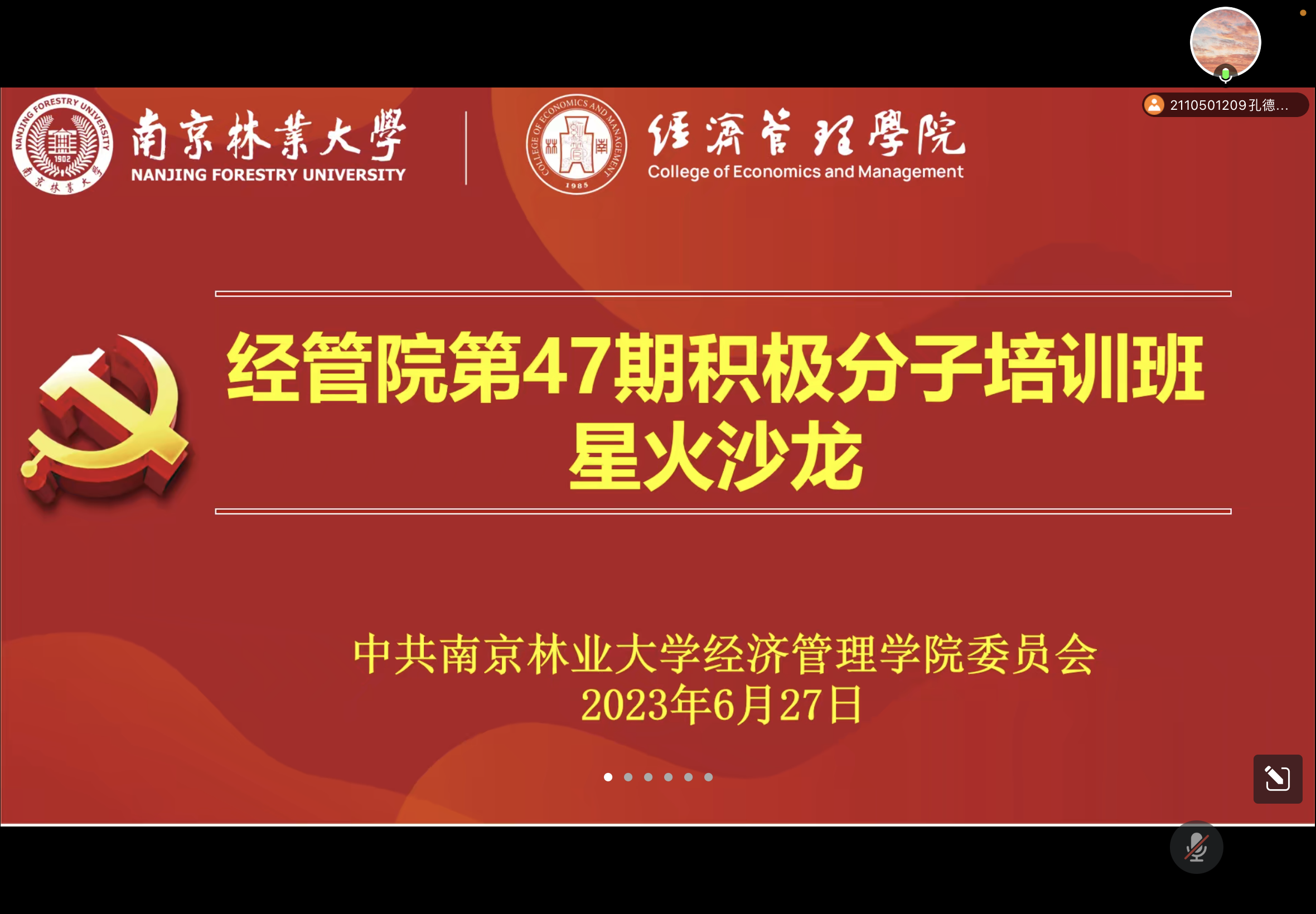 2023年6月27日下午,经济管理学院第47期入党积极分子“星火沙龙”主题活动暨积极分子培训班结业仪式在线上顺利举行。本次活动由经济管理学院党务工作中心培训部副部长孔德琪主持,经济管理学院党委组织员、研究生辅导员赵淑颖出席,经济管理学院全体47期入党积极分子参加。