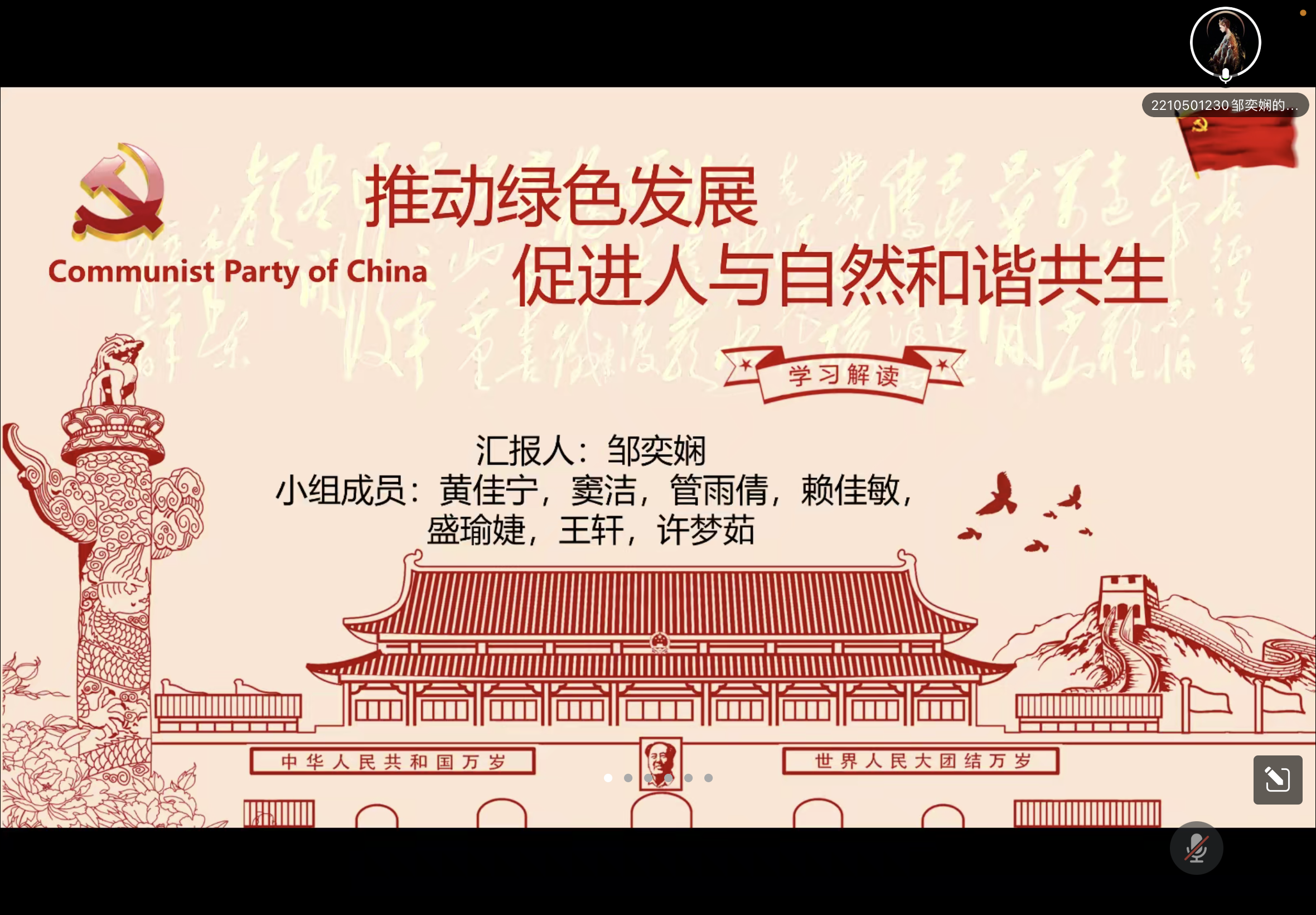 有的小组以“推动绿色发展 促进人与自然和谐共生”为主题,强调必须牢固树立和践行绿水青山就是金山银山的理念,站在人与自然和谐共生的高度谋划发展,正确处理好生态环境保护和发展的关系,倡导我们青年人应当尊重、顺应自然发展,把生态文明建设融入经济、政治、文化、社会建设各方面和全过程,为国家绿色发展建言献策。