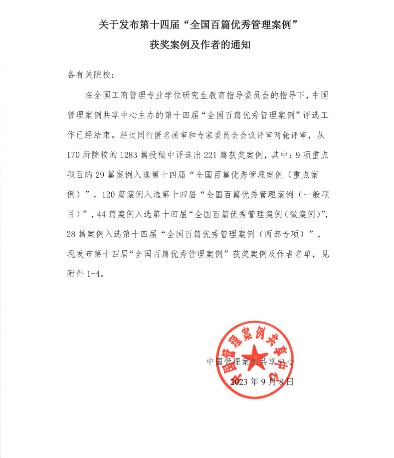 “全国百篇优秀管理案例”评选是中国管理案例届享有盛誉的重要奖项,由全国工商管理专业学位研究生教育指导委员会指导,中国管理案例共享中心组织承办,2010年迄今已举办14届。第十四届“全国百篇优秀管理案例”共收到170所院校的1283篇投稿,其中重点项目9项29篇、一般项目802篇、微案例专项309篇、西部专项143篇。经严格审核,匿名遴选和专家会审,最终入围“全国百篇优秀管理案例”重点案例29篇,一般项目120篇,微案例专项44篇,“西部项目28篇。