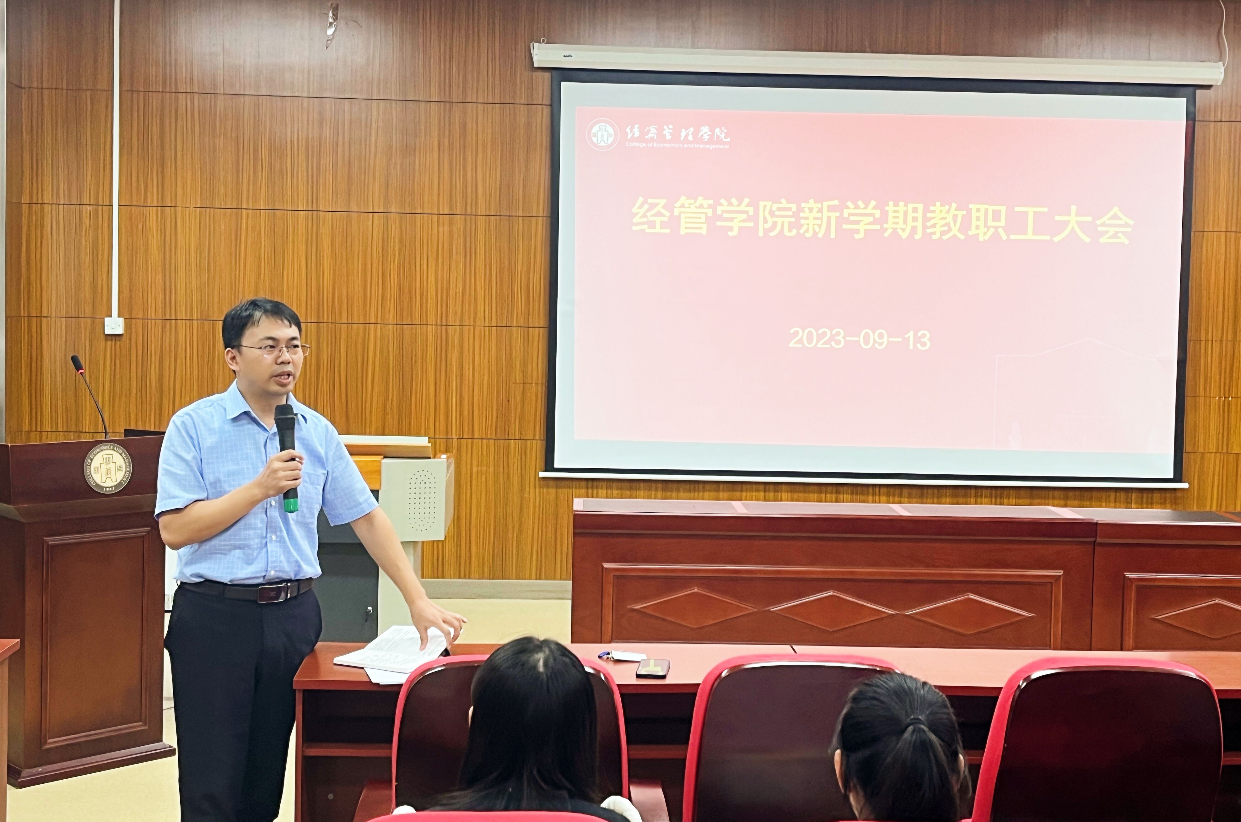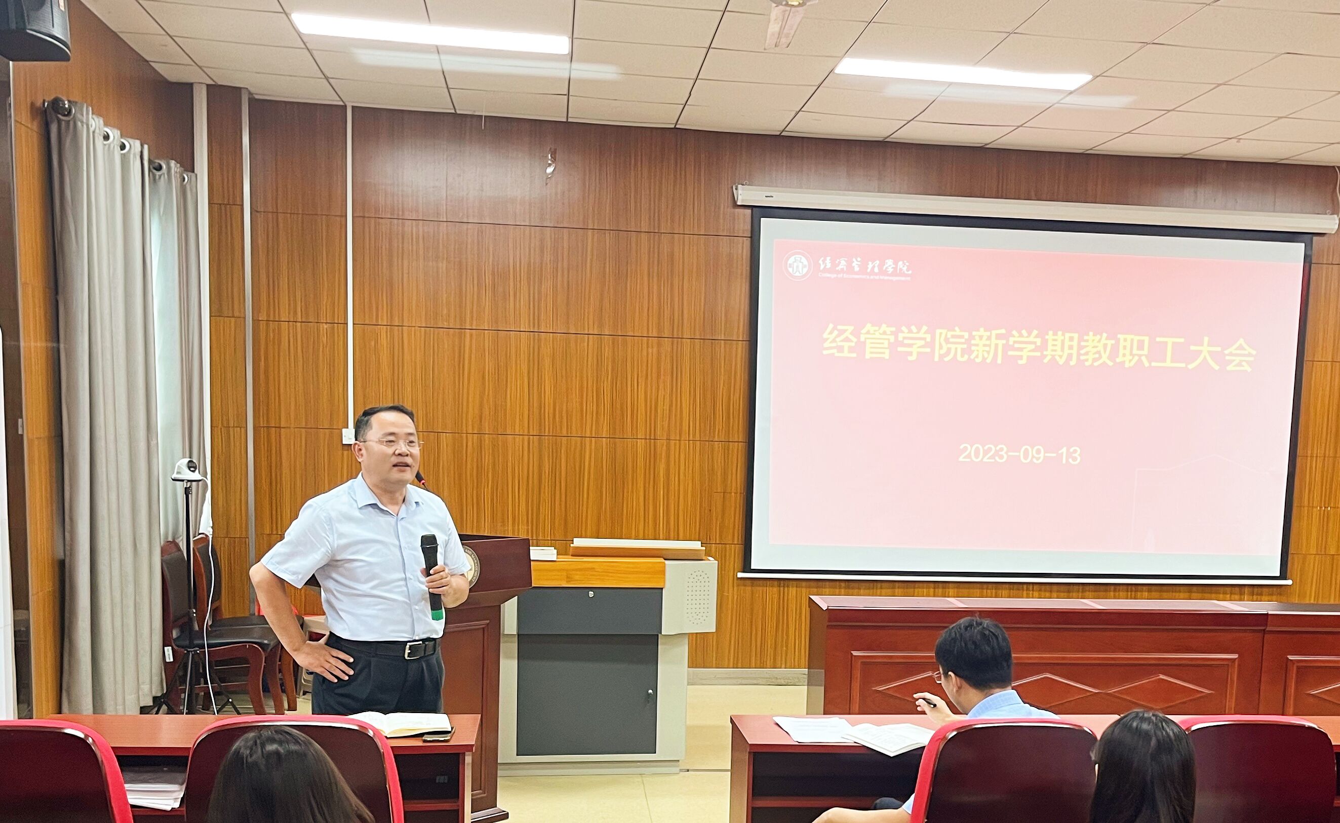 2023年9月13日下午,我院在文科楼C105召开了新学期教职工大会,总结回顾上半年工作成效,研究部署新学期工作安排。学院党政领导班子成员、全体教职工参加会议。会议由学院党委书记高强主持。